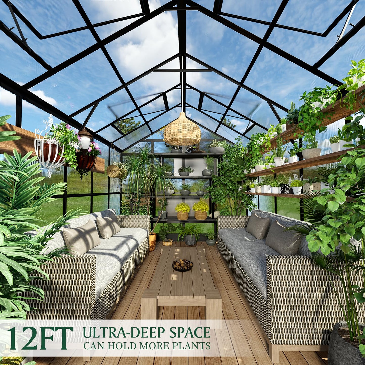 - 8x12x7.5FT Hobby Greenhouse & Sunroom:6mm Twin-wall translucent PC panels(UV Protection 99.99%),perfect for raising seedlings or heat-loving plants. Upgraded 5.2FT wall height, easy to access, and no need to bend over.