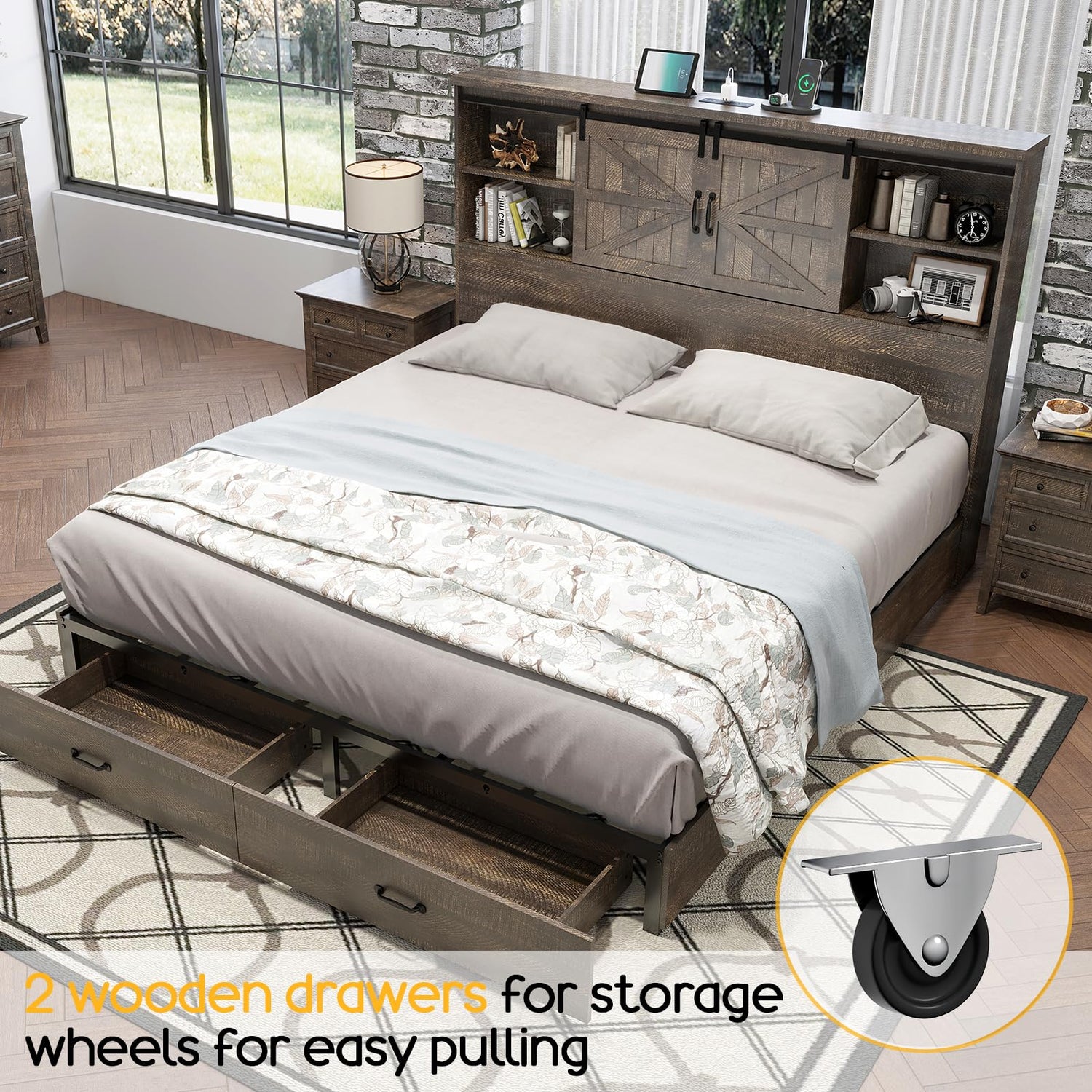 Rustic HOWE Full Size Wood Platform Bed with Bookcase Headboard and Storage Drawers