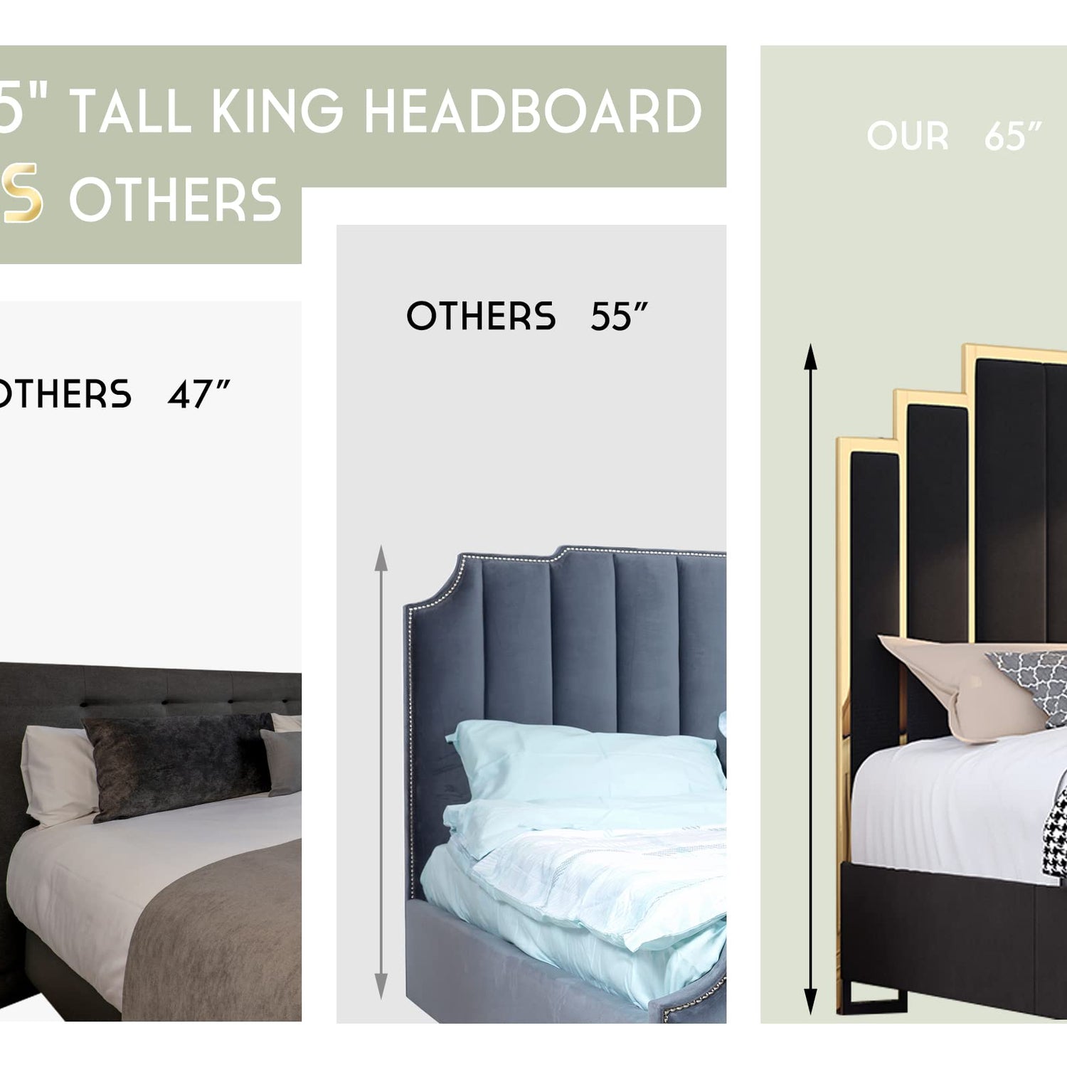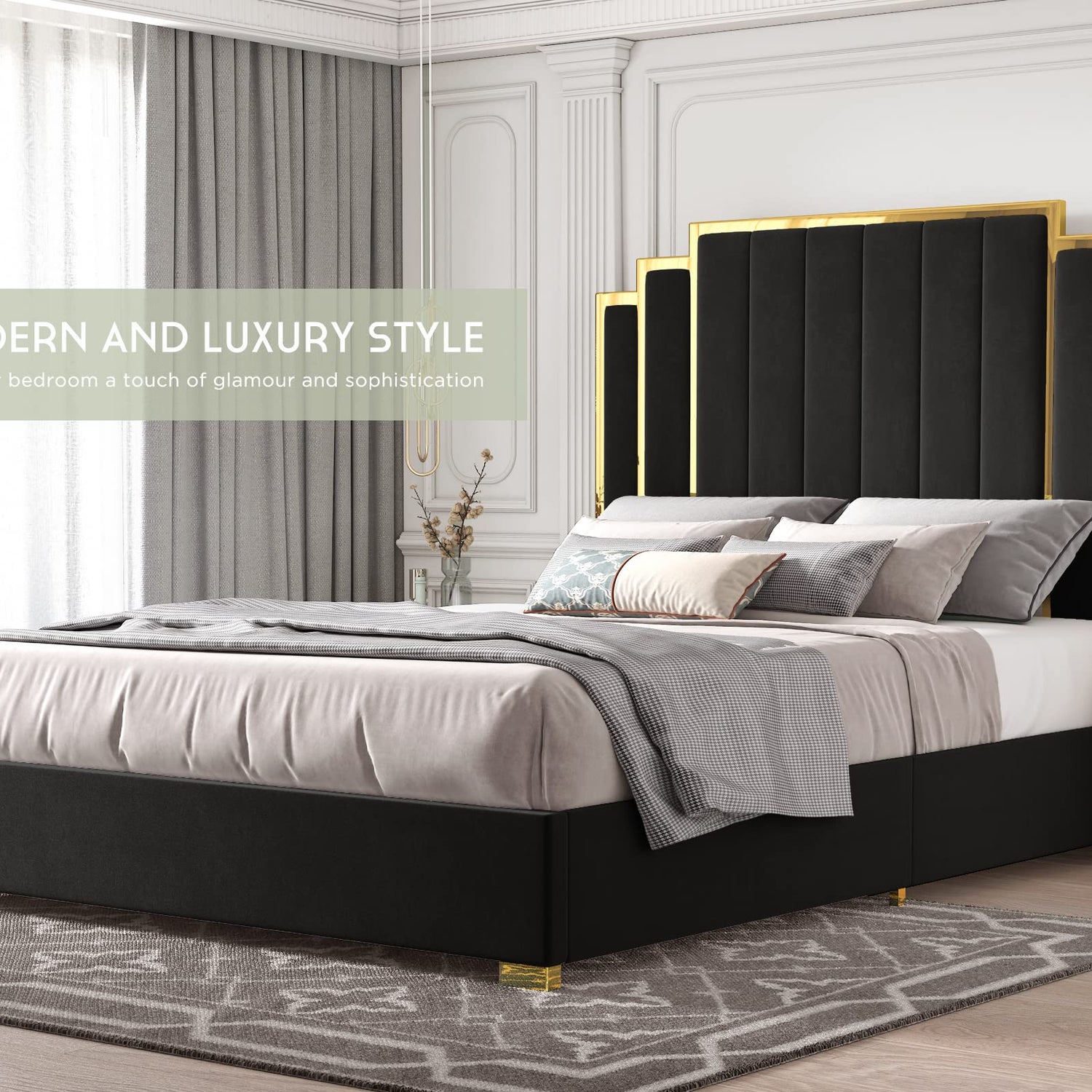 - Modern Style: Soft velvet upholstered side rails flow into 65" vertical channels headboard, supported by gold legs, king bed frame is contemporary and plush looking.
