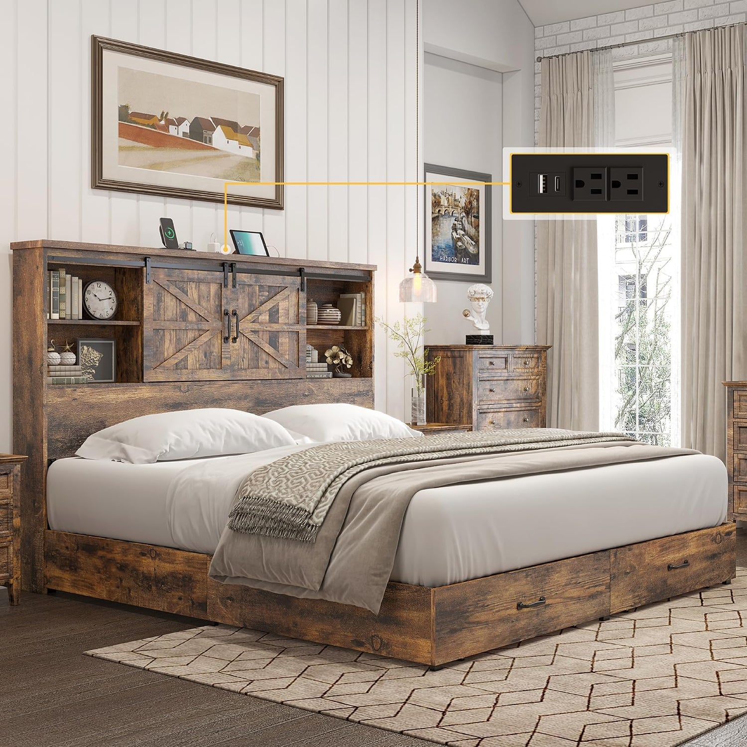 - 【Rustic Style】51.2” bookshelf headboard with sliding barn door and wooden under-bed drawers, charming wood grain and color. Ideal for country or farmhouse bedrooms.