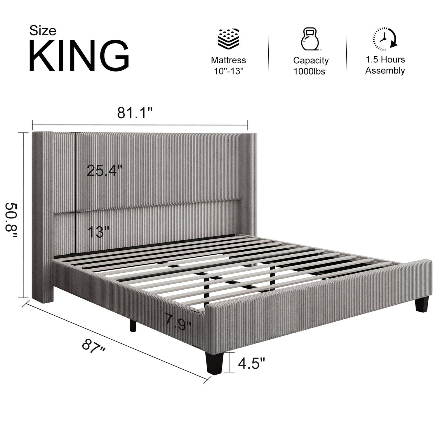 HOWE King Size Upholstered Platform Bed Frame, Wingback Bed with 50.8" Headboard, Corduroy/Solid Wood Leg/No Box Spring Needed/Noise Free/Taupe
