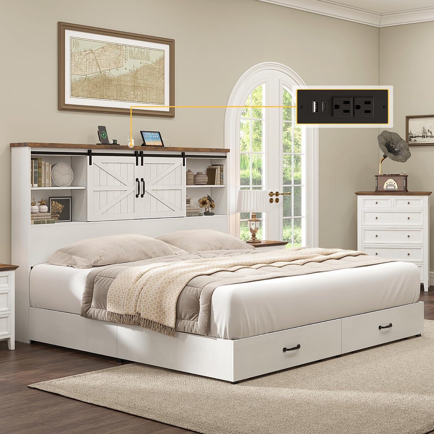 HOWE King Size Wood Platform Bed Frame with 51.2" Bookcase Headboard, Storage Bed with Sliding Barn Door Charging Station 2 Drawers, No Box Spring Needed/Farmhouse/White