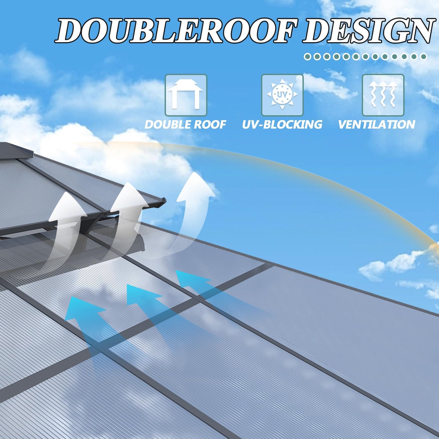 - 【POLYCARBONATE ROOF】: The polycarbonate roof is designed to minimize rainwater collection, promote air circulation and ventilation inside the gazebo while protecting it from harmful UV rays. You can enjoy sunbathing under this gazebo without worrying about getting sunburned. Also, the translucent polycarbonate roof does not block the sunlight in winter, so you can enjoy sunbathing in it.