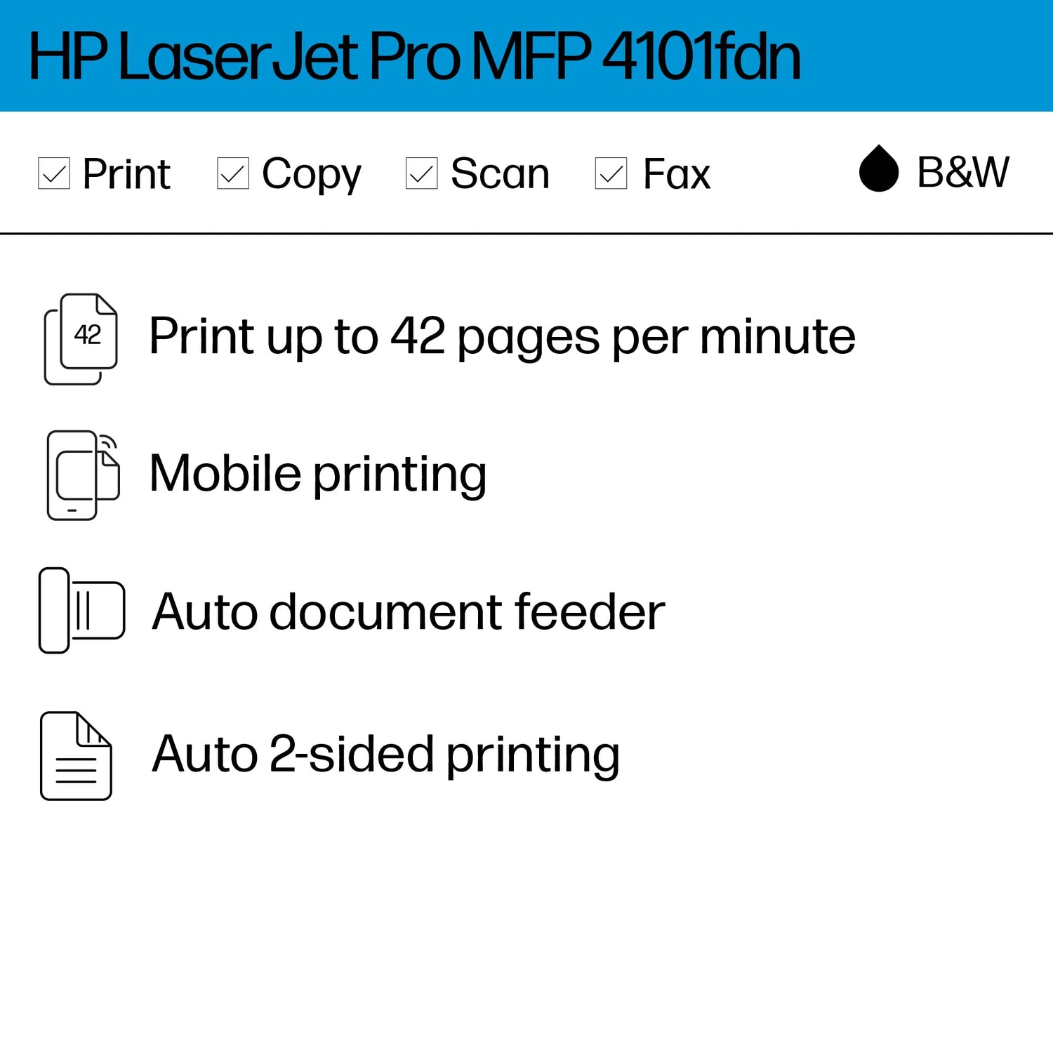 - FROM AMERICA'S MOST TRUSTED PRINTER BRAND – The LaserJet Pro MFP 4101fdn is best for up to 10 users, with intuitive tools toset up and manage your printer