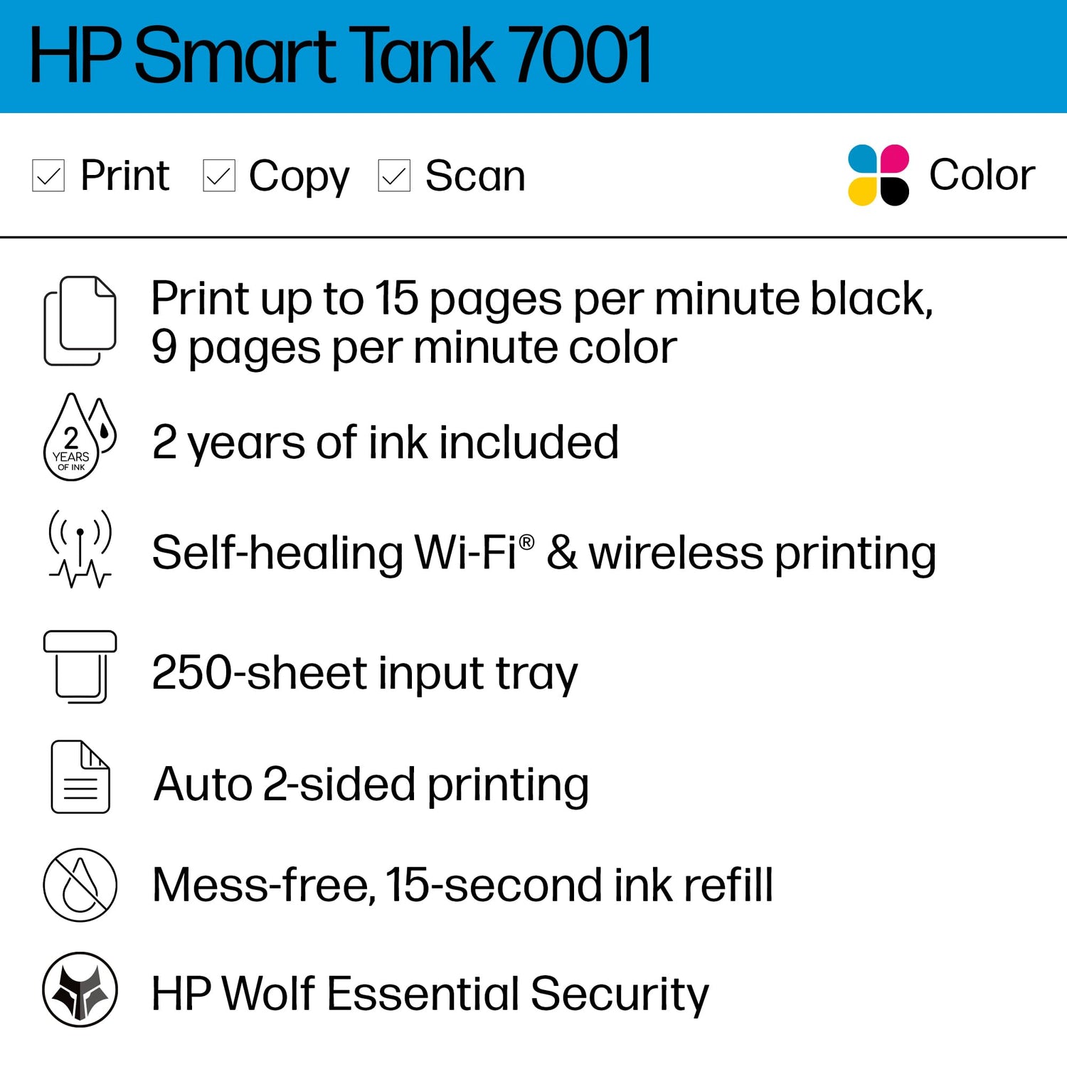 • FROM AMERICA'S MOST TRUSTED PRINTER BRAND – The Smart Tank 7001 is perfect for families printing a variety of color documents in high volumes. Print up to 15 pages per minute black and 9 pages per minute color.