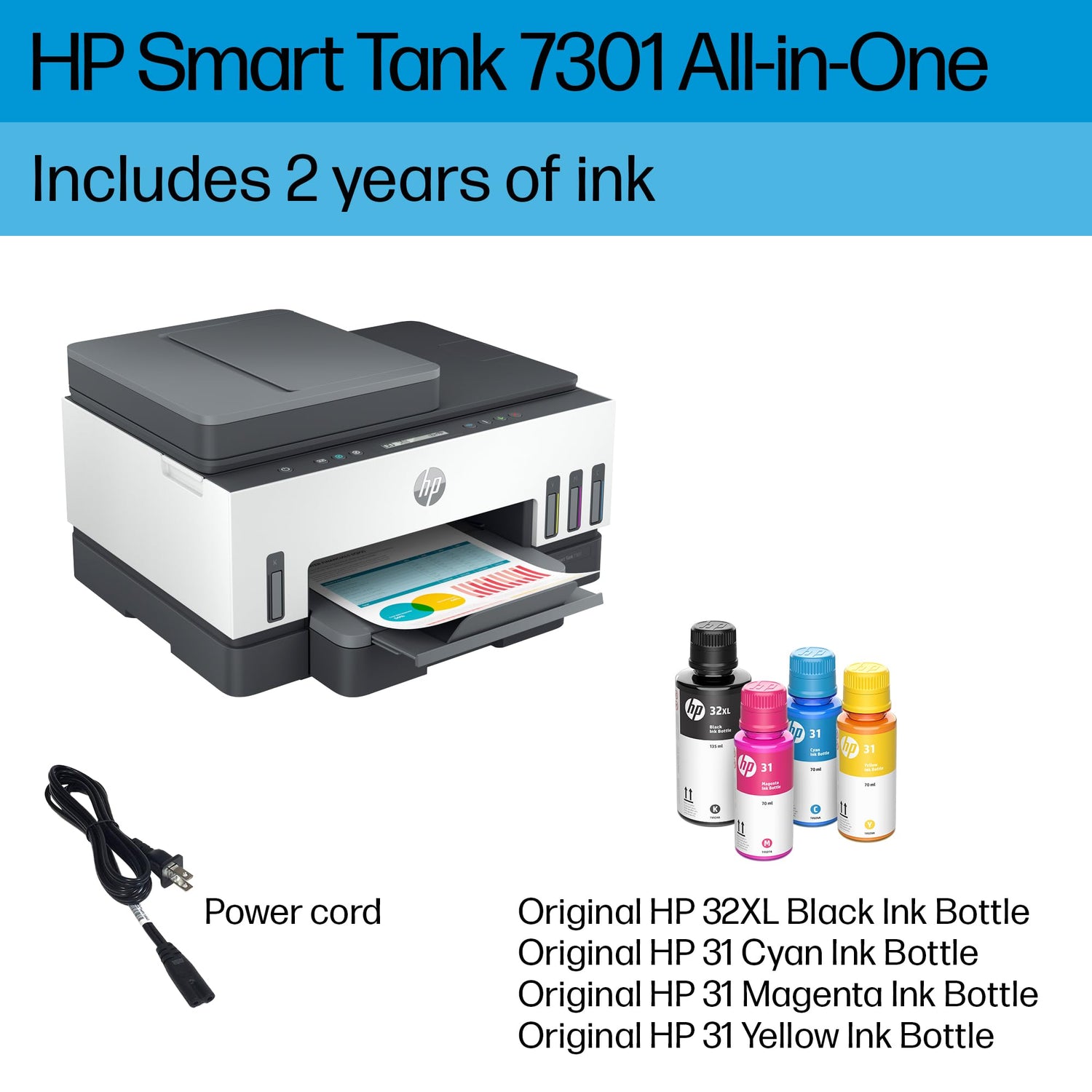 Details: "The HP Smart Tank 7301 makes printing seamless from start to finish for the whole family with a high-capacity ink tank, automatic document feeder and wireless and Ethernet connectivity. Create outstanding-quality color documents at a low cost with up to two years of Original HP Ink included in the box."