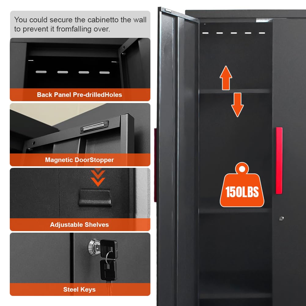 - Adjustability: The adjustable shelves can be positioned at different heights based on your storage needs. Each shelf in the cabinet is capable of bearing up to 150 pounds of weight