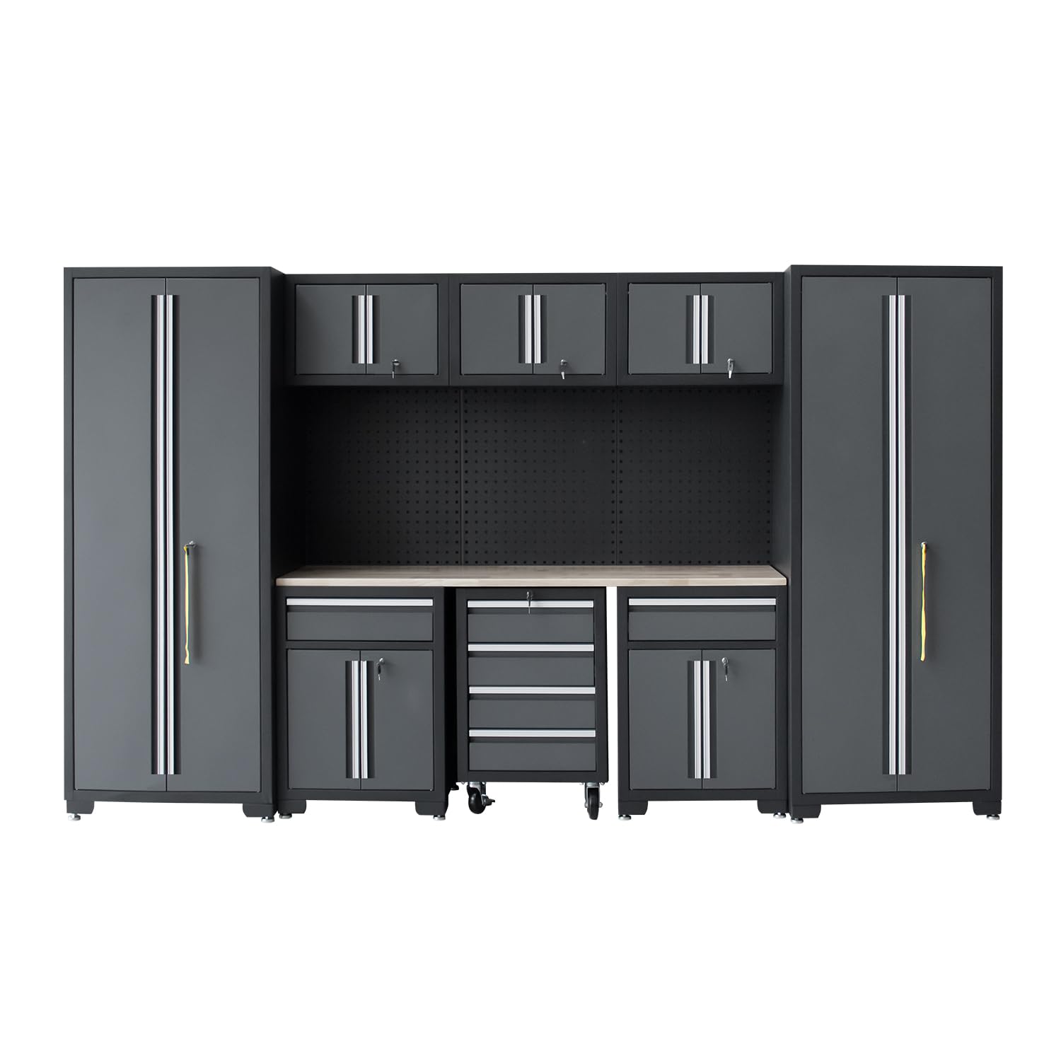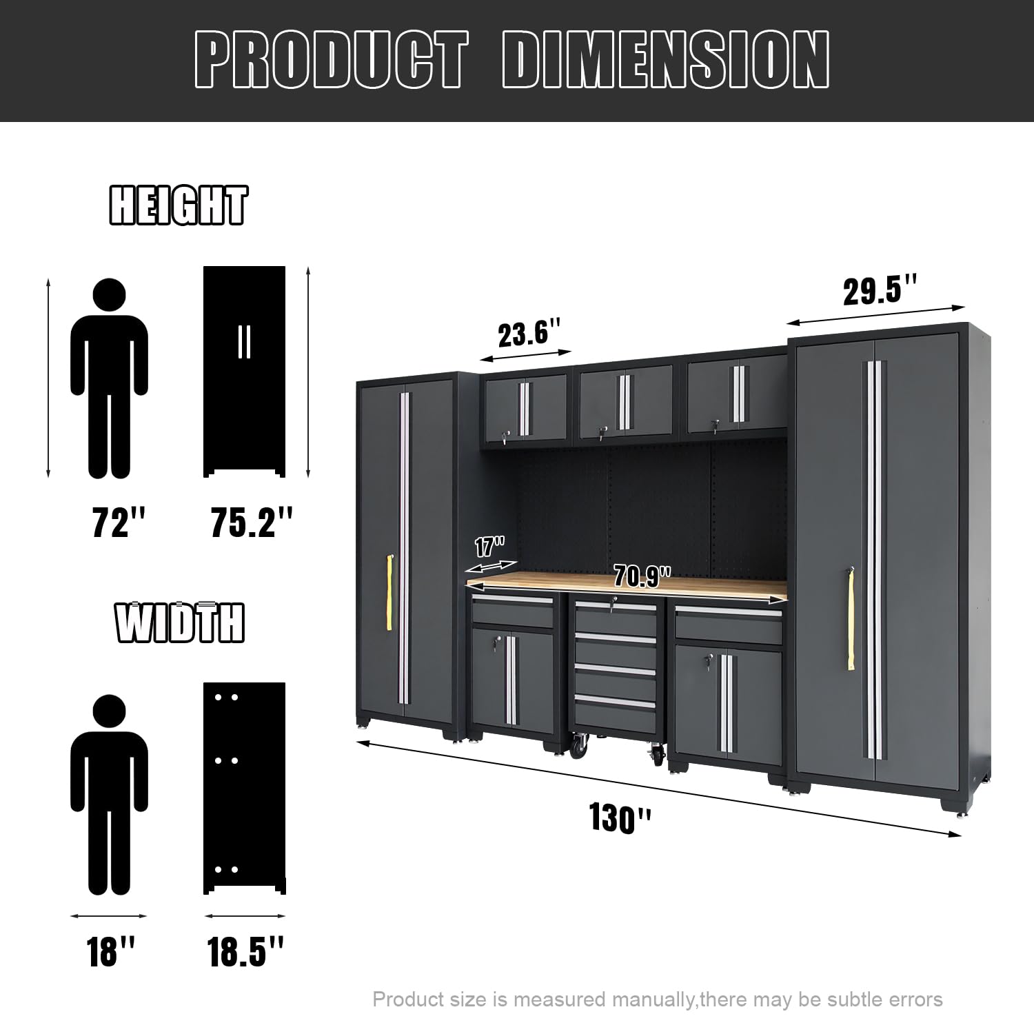 - Specification: Garage storage system includes locker x 2, wall cabinet x 3, 1-drawer cabinet x 2, 4-drawer roller cabinet x 1, 71 in workbench x 1, pegboard x 3. Item Weight: 507.1 lbs; Package Size: 45.3 x 33.5 x 79.1 in; Item Size: 130 x 18.5 x 75.2 in; Item Color: Black and Grey