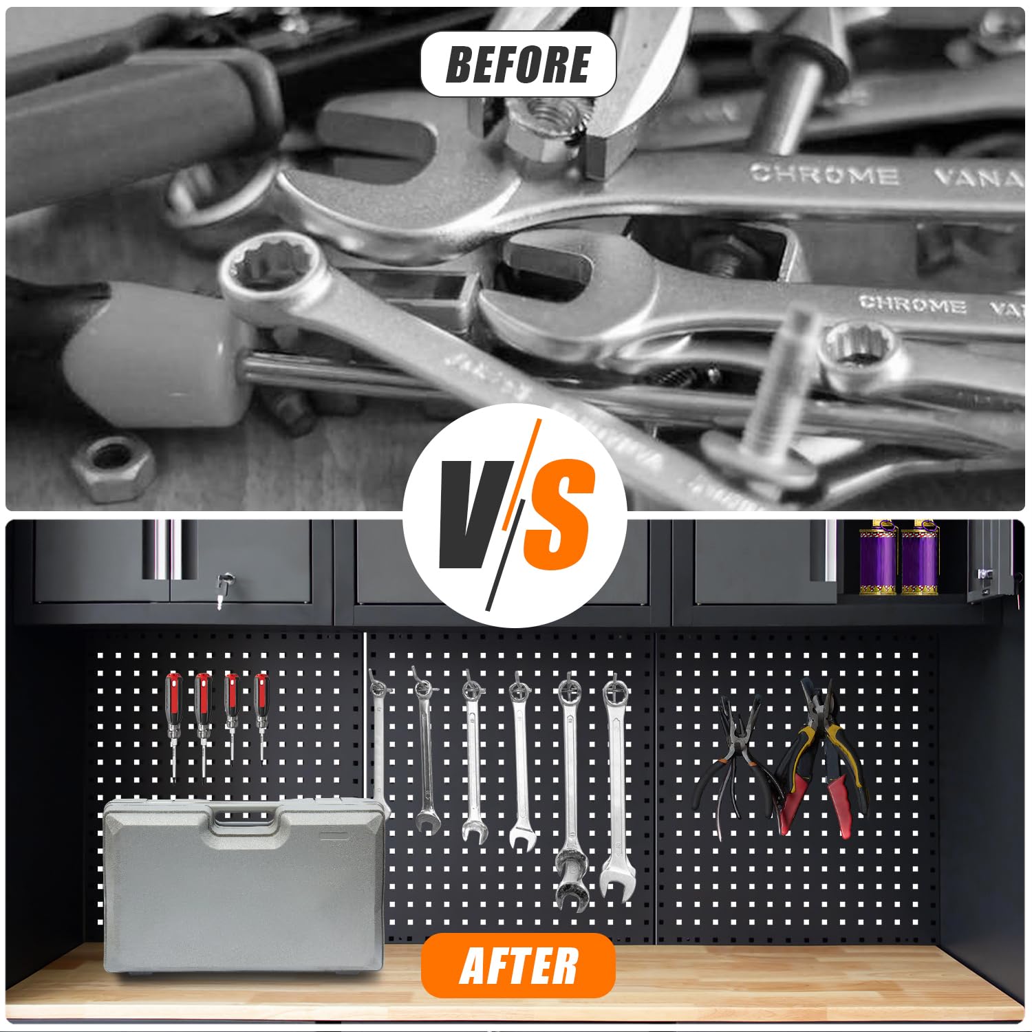 - Practical Pegboard: The pegboard is designed to efficiently organize small objects and provide a versatile storage system. It's compatible with standard 1/4-inch and 1/8-inch pegboard hooks, bins, and accessories, offering flexibility in organizing various tools and making it suitable for use in garages, sheds, workshops, and other spaces where utility tools are kept. It's more than 10 times stronger than a conventional pegboard. By utilizing the pegboard, you can neatly arrange and store your tools, ensuring easy access and efficient organization