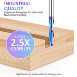 - [HIGH-QUALITY COATING AND MATERIAL] Premium solid carbide router bits with nano blue coat feature with high hardness, heat resistance, and long-lasting cutting-edge performance to ensure high work efficiency. Industrial quality control to ensure the best performance. Up to 2.5 times longer life compared to uncoated bits.