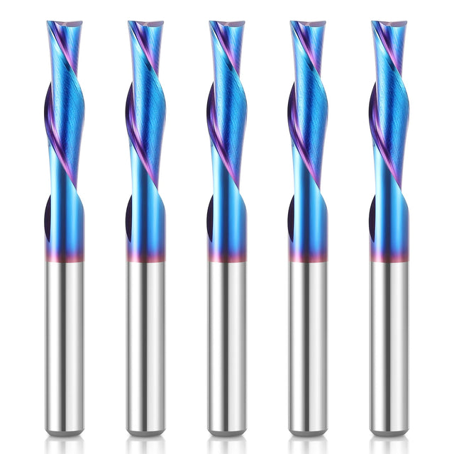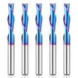 HQMaster 5 Pcs Spiral CNC Router Bits Set Down Cut 1/4” Shank Solid Carbide Spiral Downcut CNC Bits with Nano Blue Coating End Mill for Wood Cut