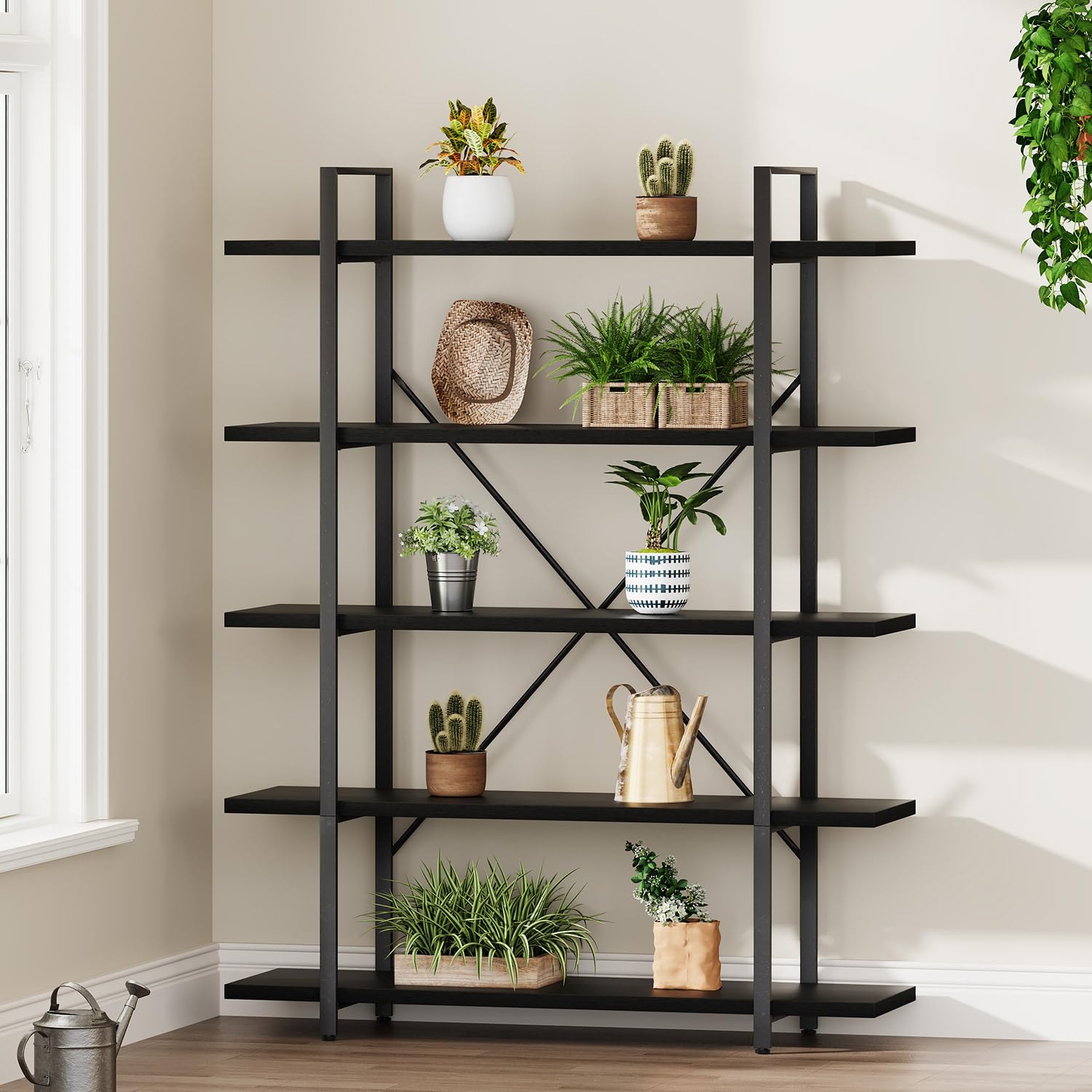 - 【Sturdy Construction】: Constructed with high-quality MDF board and thick steel metal frame, the each shelf of the black bookcase can hold up 100 lbs, and totally 500 lbs for the 5 tier bookshelf. The additional X-shaped reinforcing bar provides strong support for this storage shelves and ensures its stability and durability. Adjustable levelers of the wood and metal black shelf help eliminate wobble, no wiggle and floor scrape.