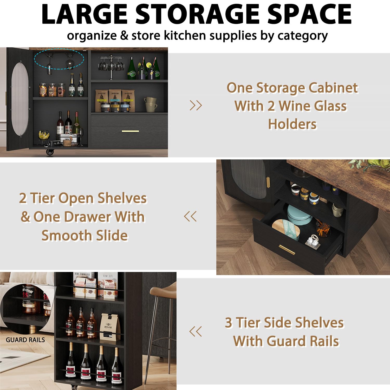 - Ample Storage with Smart Organization : This farmhouse kitchen island with storage features two spacious tabletops (39.3" L x 15.7" W and 47.2" L x 23.6" W), a glass-door cabinet with two wine glass holders, two open shelves, a drawer for utensils, and a 3-tier side rack for spices or tools — keeping your space organized and clutter-free.