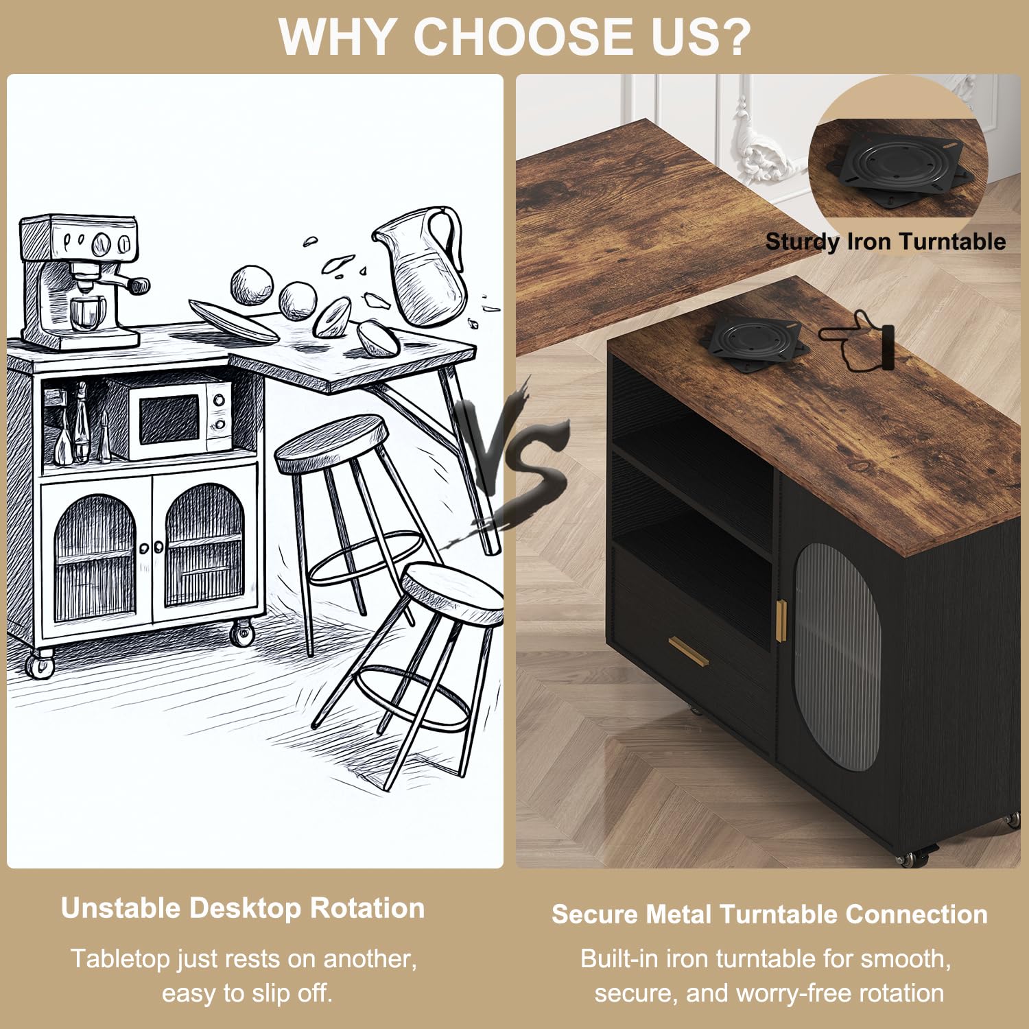 - 360° Rotating Design for Flexible Layouts : Rotate this rustic kitchen island to fit your layout — 180° as a dining table, 0° as a sideboard, or 90° as a work/bar table. In small kitchens, this design can replace multiple pieces of furniture to save space. The sturdy turntable mechanism makes rotation effortless, stable, and secure.