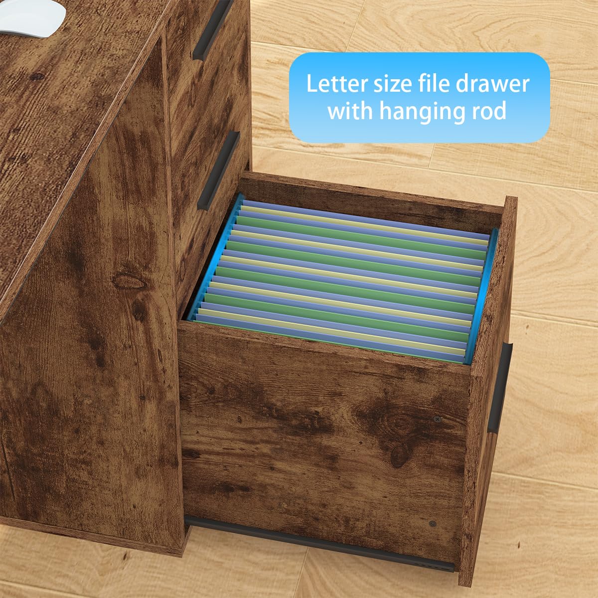 HSH L Shaped Computer Desk with File Drawers, Large Metal Wood L Shape Table with Storage Cabinet Shelves, Reversible Corner Home Office Executive Writing Study Workstation Desk, Rustic Brown, 59 Inch