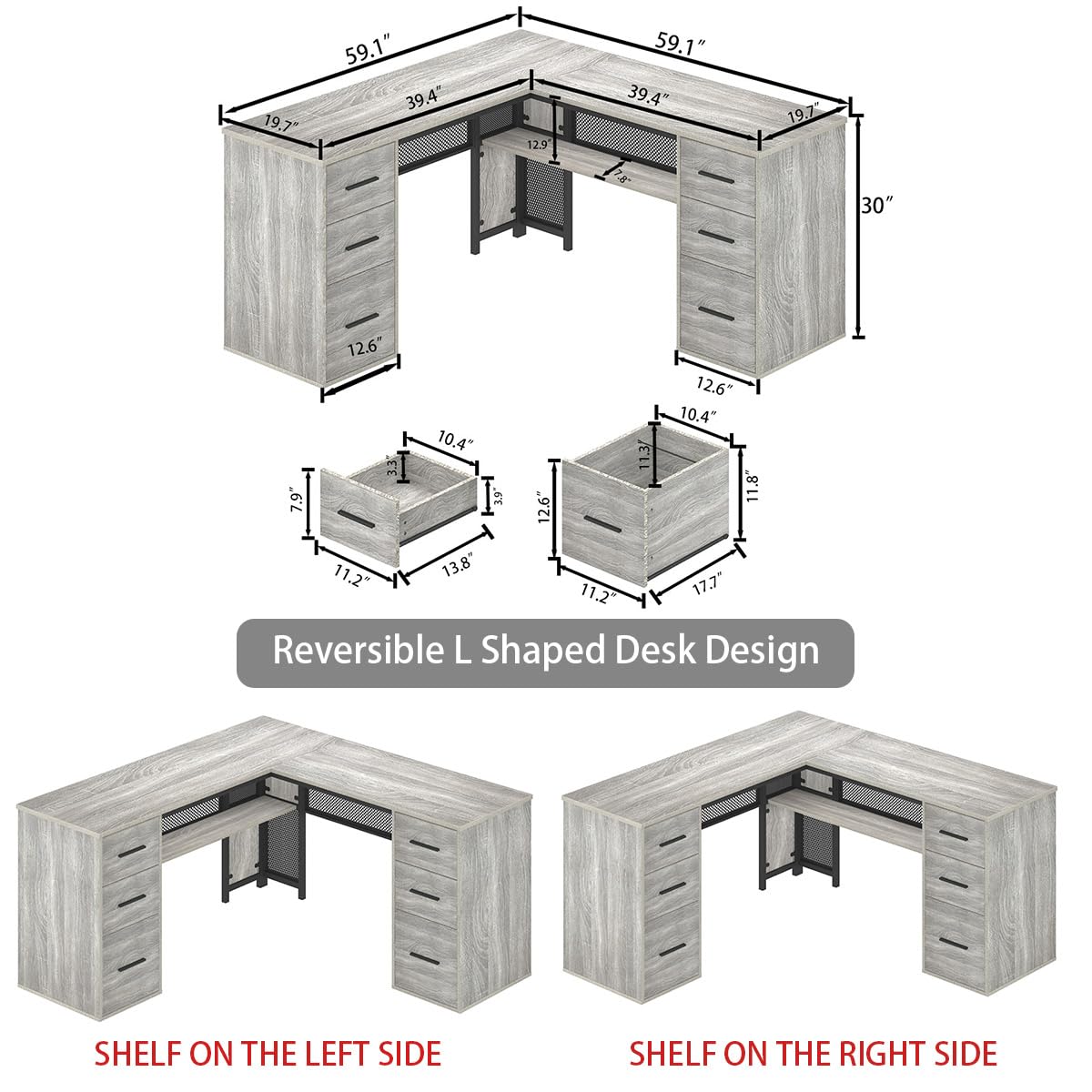 - 【Reversible and Space-Saving】: This home office grey desk with drawers features a l-shaped structure, allowing the desk to be placed in the corner or against the wall, maximizing the utilization of space. This l shaped desk is reversible, you can place the storage shelves on the left side or right side. Symmetrical design presents a sense of balance, harmony, and neatness. It’s the perfect addition to your workspace.