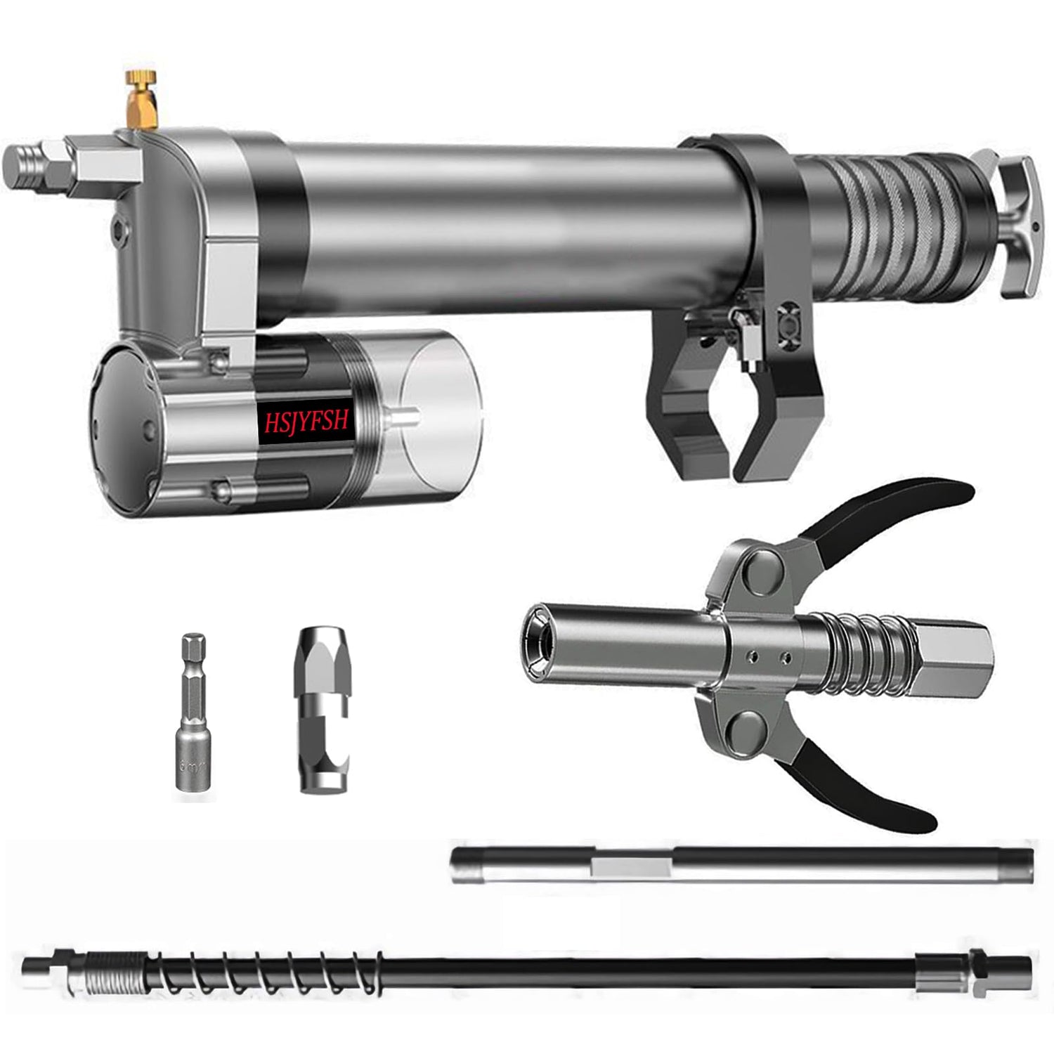 - 【GREASE GUN KIT】:Grease gun adapter*1, 14 OZ Load grease tube body*1,12'' high pressure Hose*1, 6''extension rigid pipe*1, locking grease gun coupler*1,grease nozzle fittings*1,special sleeve*1, hexagon wrench*1