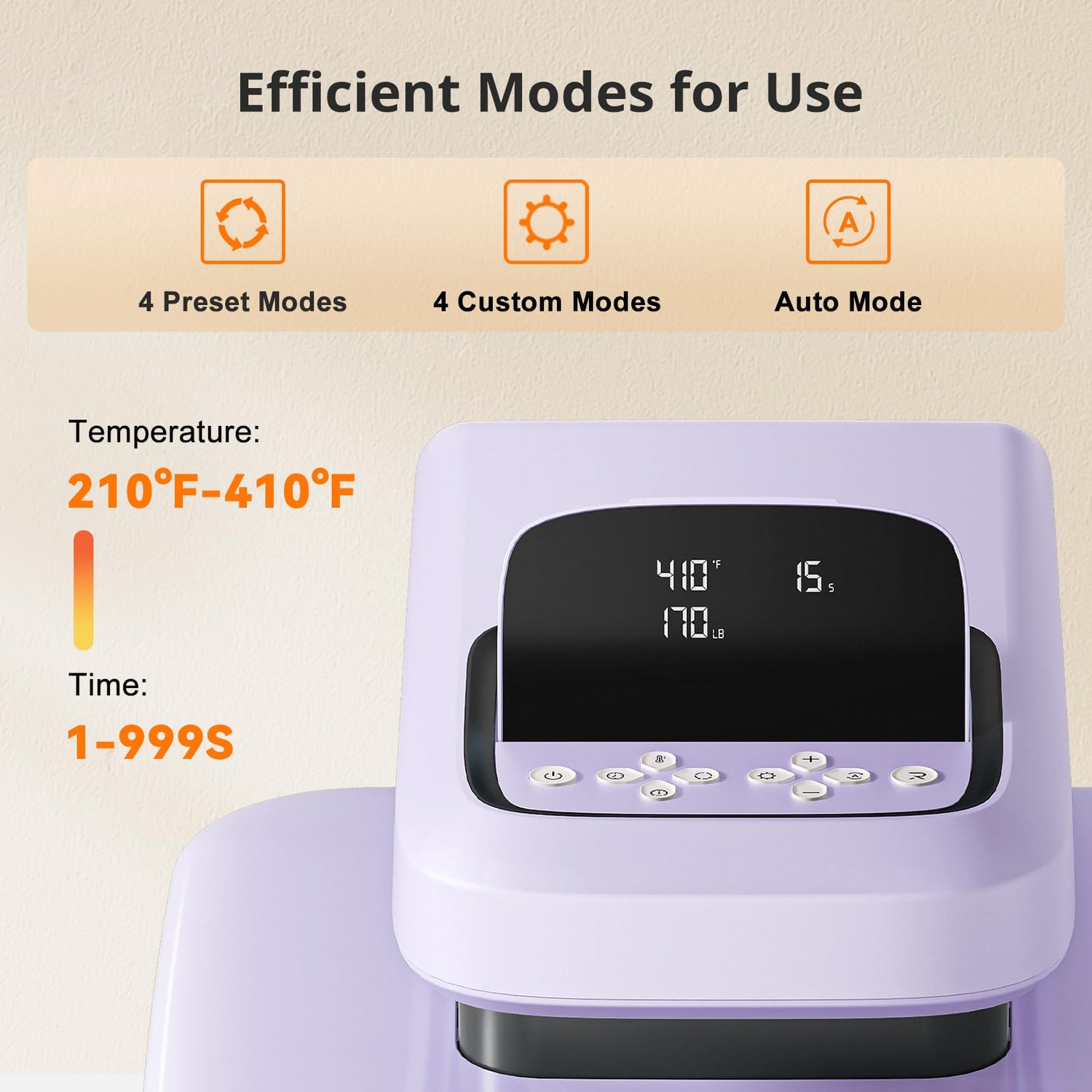 - 【Auto Heat Press & Hands Free】After setting up the heat press parameters, you only need to press "R" button, HTVRONT heat press will automatically press your design, the machine will buzz when the timer is over to remind you that the press is finished and release the material automatically. In this way, you can work on something else while it’s pressing, greatly improving your work efficiency.