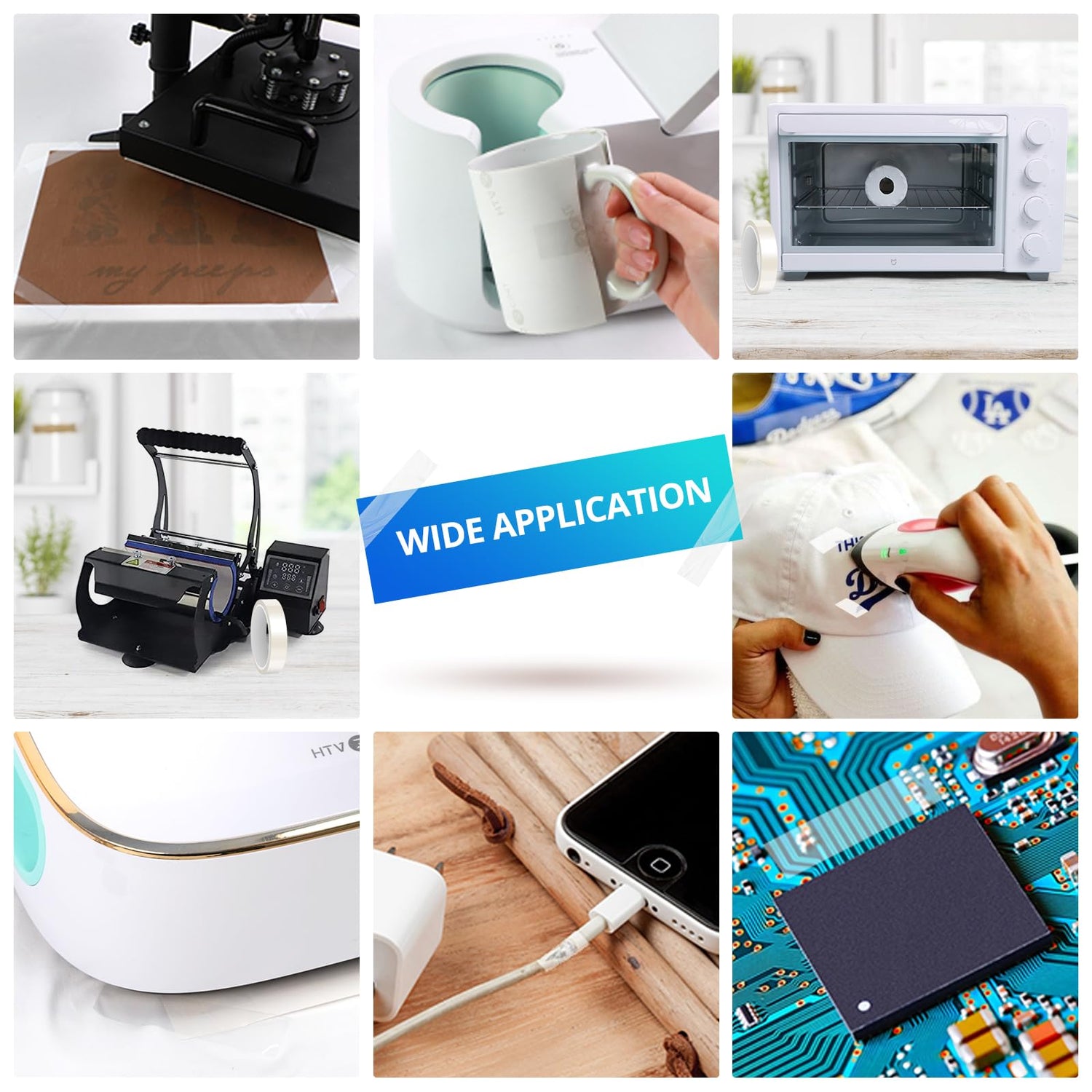 - 【WIDE APPLICATION】:Our heat tape performs well compatibility in different industries! Heat resistant tape can withstand the heat of the heavy-duty heat press, it's not only suitable for sublimation on cups but also ideal for 3D printers and heat transfer vinyl on various fabrics. This heat transfer tape is also widely used in the electronics industry for electrical insulation of transformers, motors, coils, capacitors