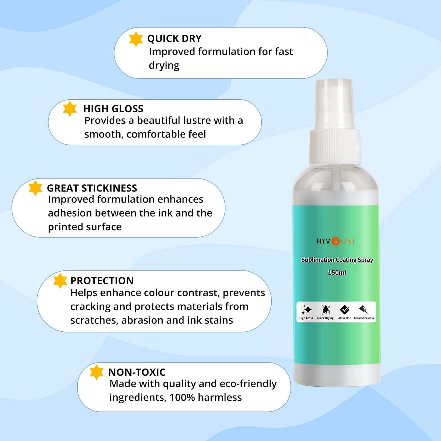 - [Upgraded Formula & Large Capacity] After upgrading the formula, sublimation spray is safer and non-toxic. HTVRONT designed the sublimation spray coating with simplicity in mind. Whether you're a seasoned pro or just starting out, you'll find it easy to use. This sublimation spray for cotton also comes with 2pcs 150ml larger capacity than most competitors on the market, which means fewer interruptions and more time for you to focus on what you do best – creating stunning sublimated items