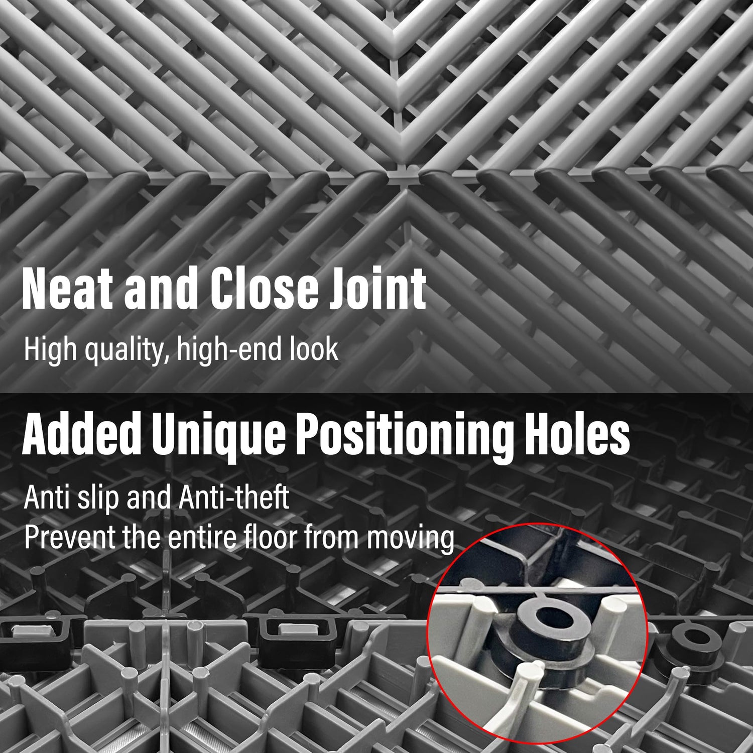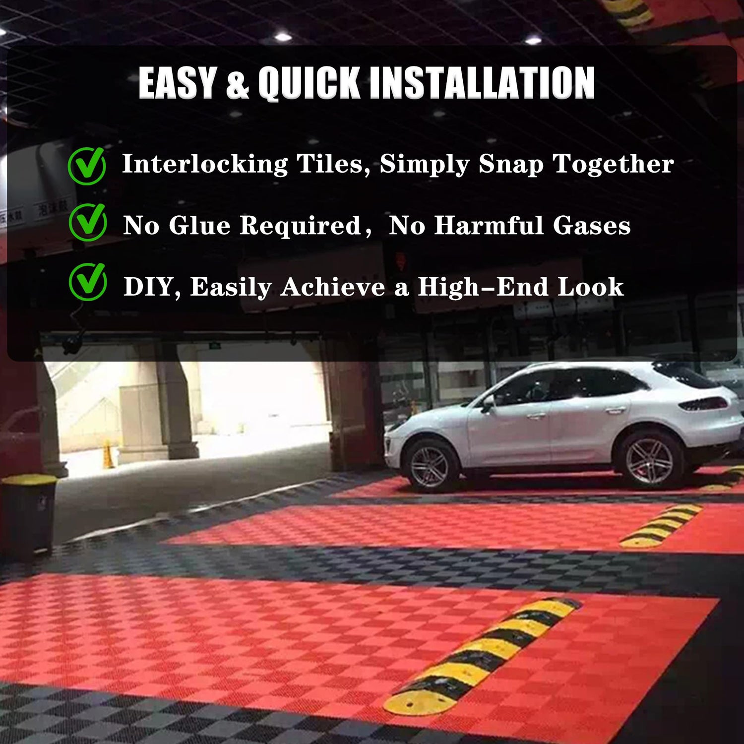 - Multipurpose Floor Tile:The material of our garage flooring tile is waterproof and the surface is treated by frosting, with very good slip resistance.They are ideal for both indoor and outdoor use,such as garage,car-washing center,warehouse,4s show room,balcony,deck,etc.