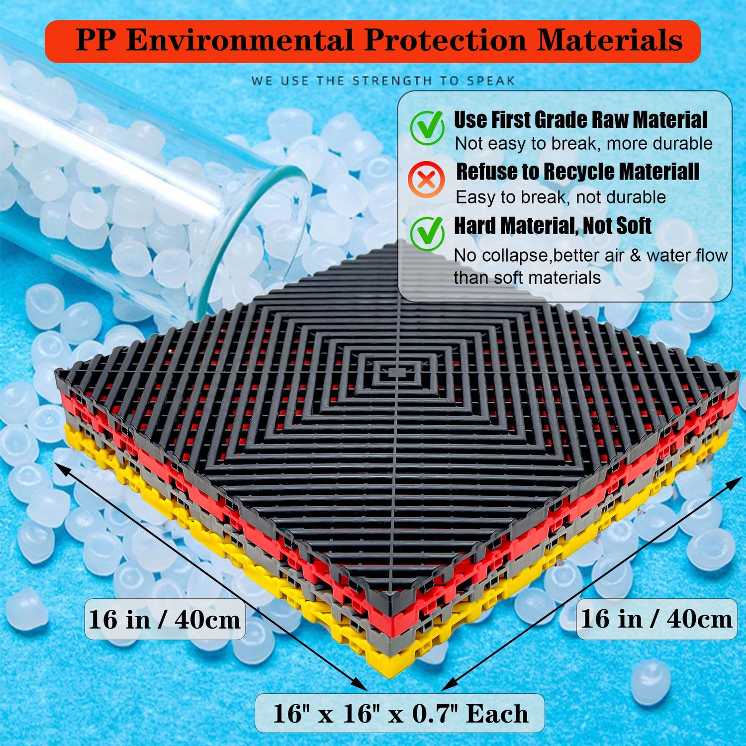 - What You Get: Including 24 durable square drainage mats, each measures 16''L x 16''W x 0.75''H. Total area 41.3 square feet.They can be cut or trimmed on site for the custom shaped areas.