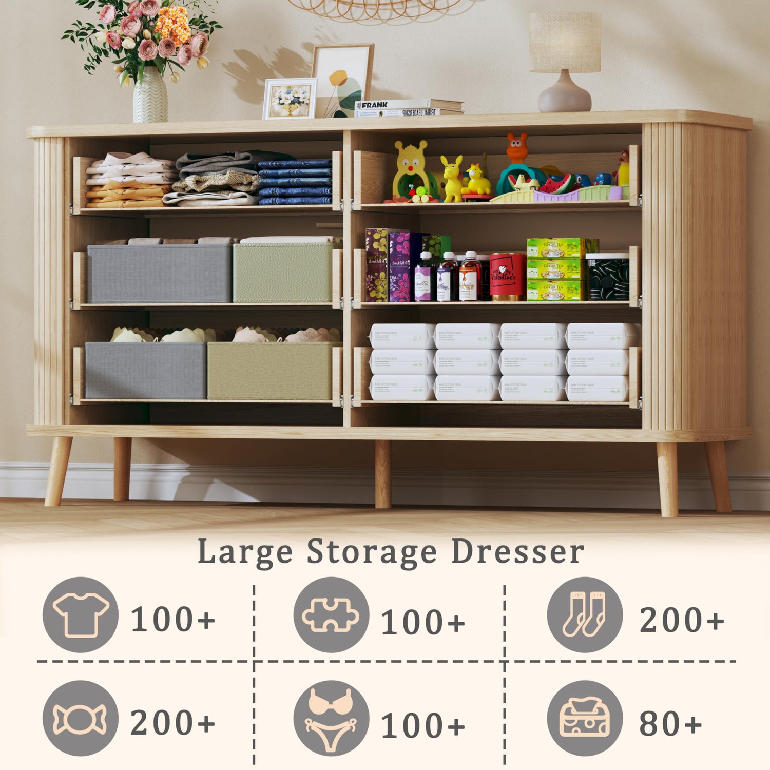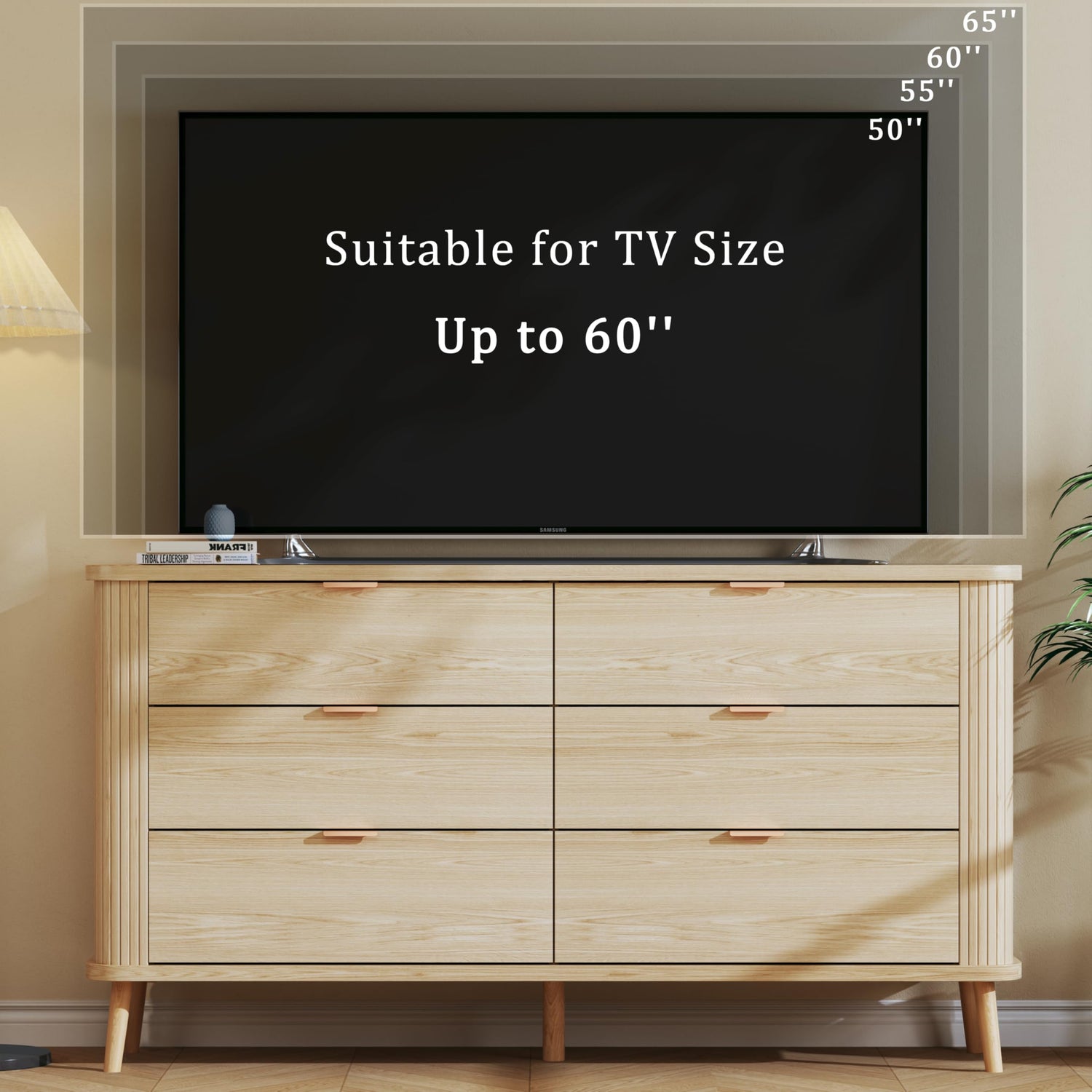 HUAHUU Fluted 6 Drawers Dresser for Bedroom, 55" Mid Century Modern Dresser & Chests of Drawers, Curved Profile Design, Dressers TV Stand, Wood Storage for Hallway, Entryway, Oak