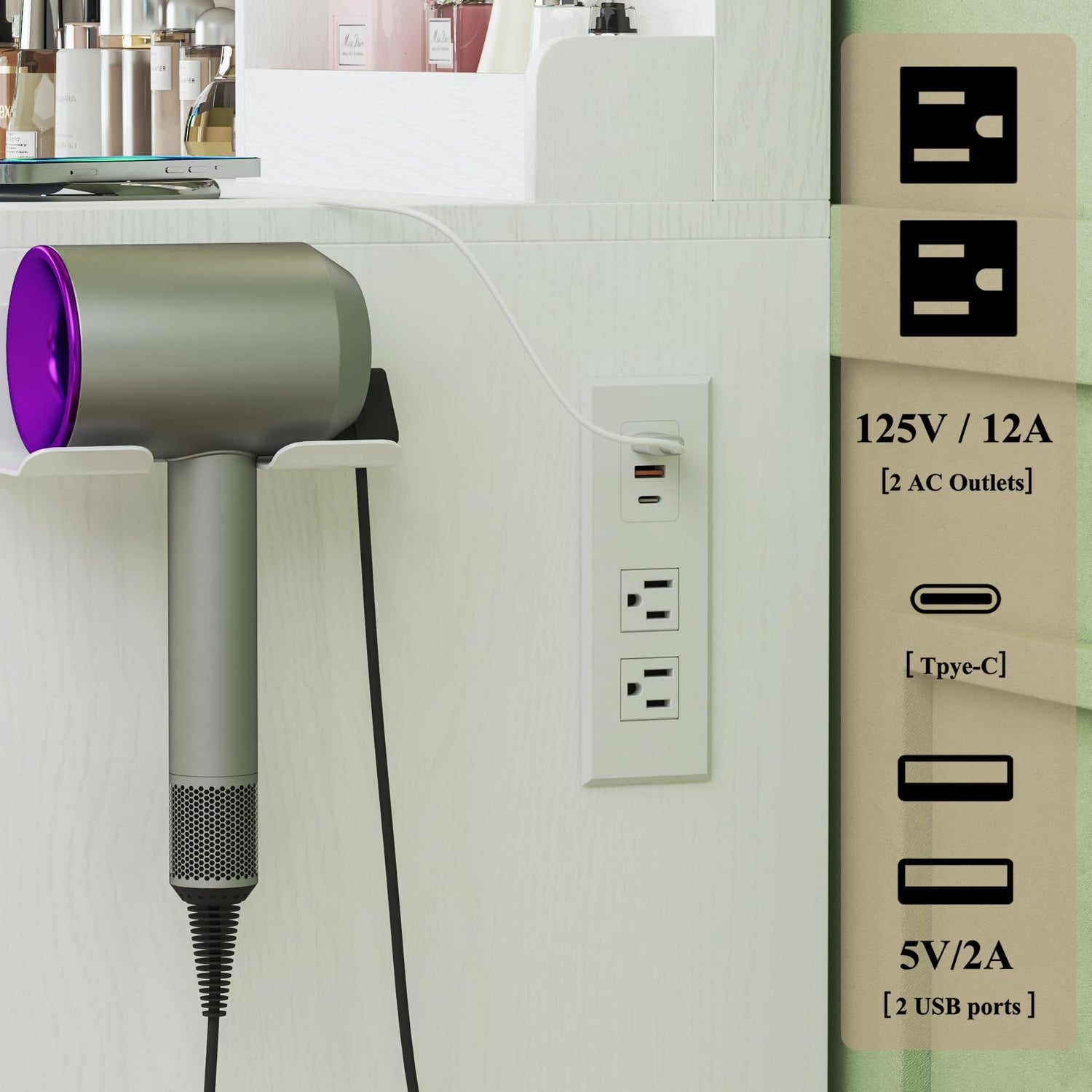 - White Vanity with Charging Station: The vanity with lights with lighted mirror features 2 standard plug sockets, 2 USB ports, and 1 Type-C outlet and 1 hair dryer rack, keeping your hair tools and mobile devices easily accessible