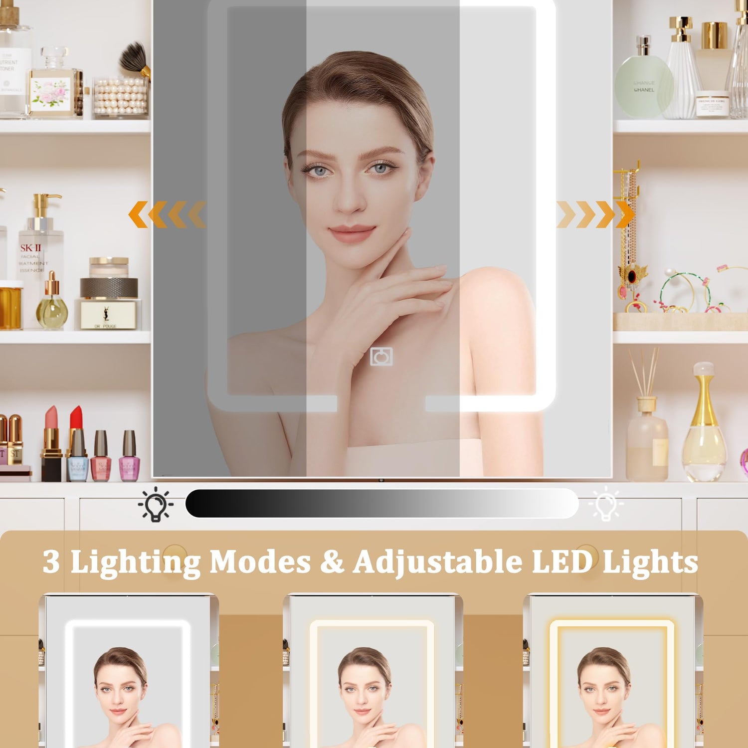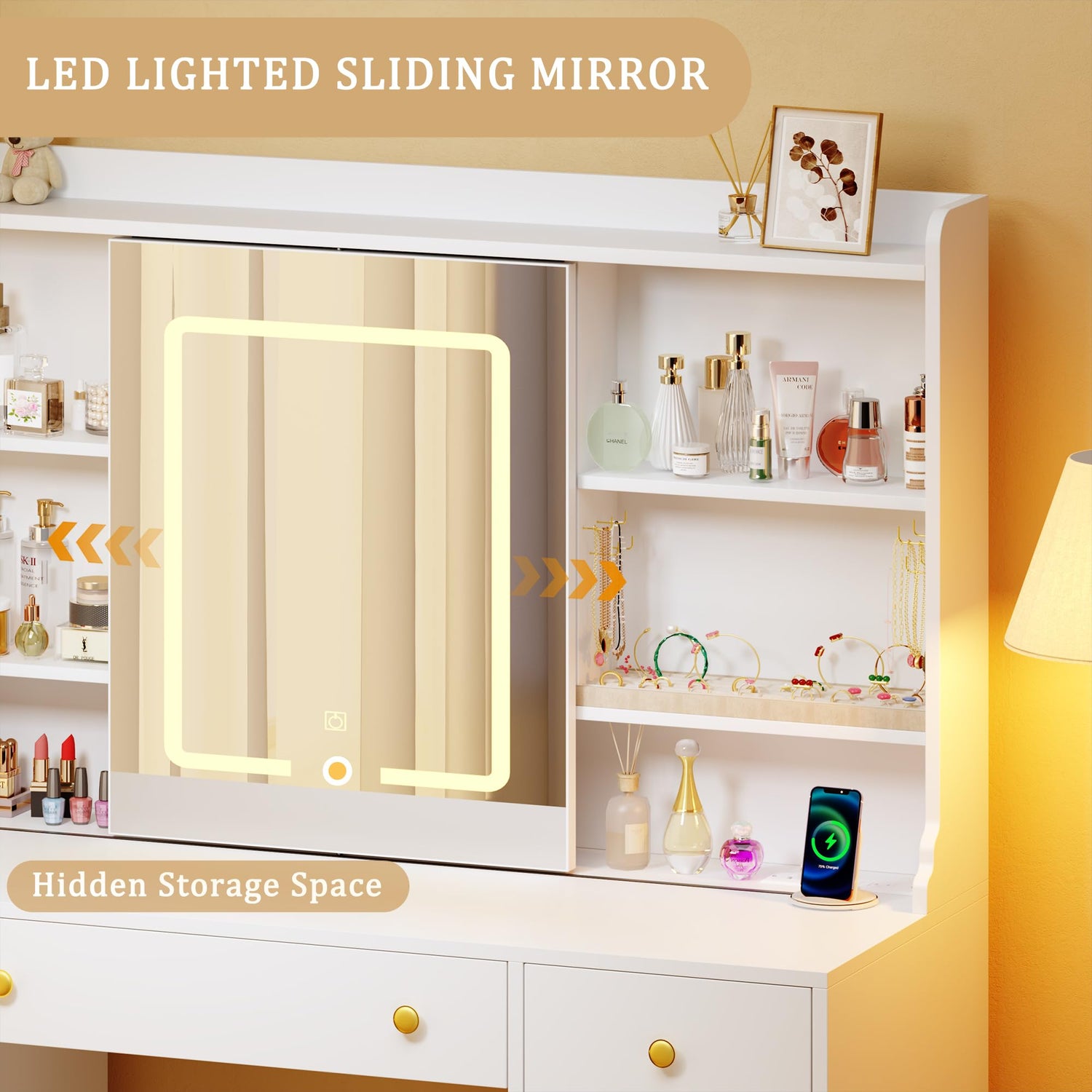- 3 Color Lighting Modes & Adjustable Brightness: Vanity desk with sliding mirror is available in 3 colors and adjustable brightness, adapts to various ambient light to achieve perfect makeup. Tap the touch switch of the makeup vanity to change the color mode, or long-press the switch to adjust the brightness