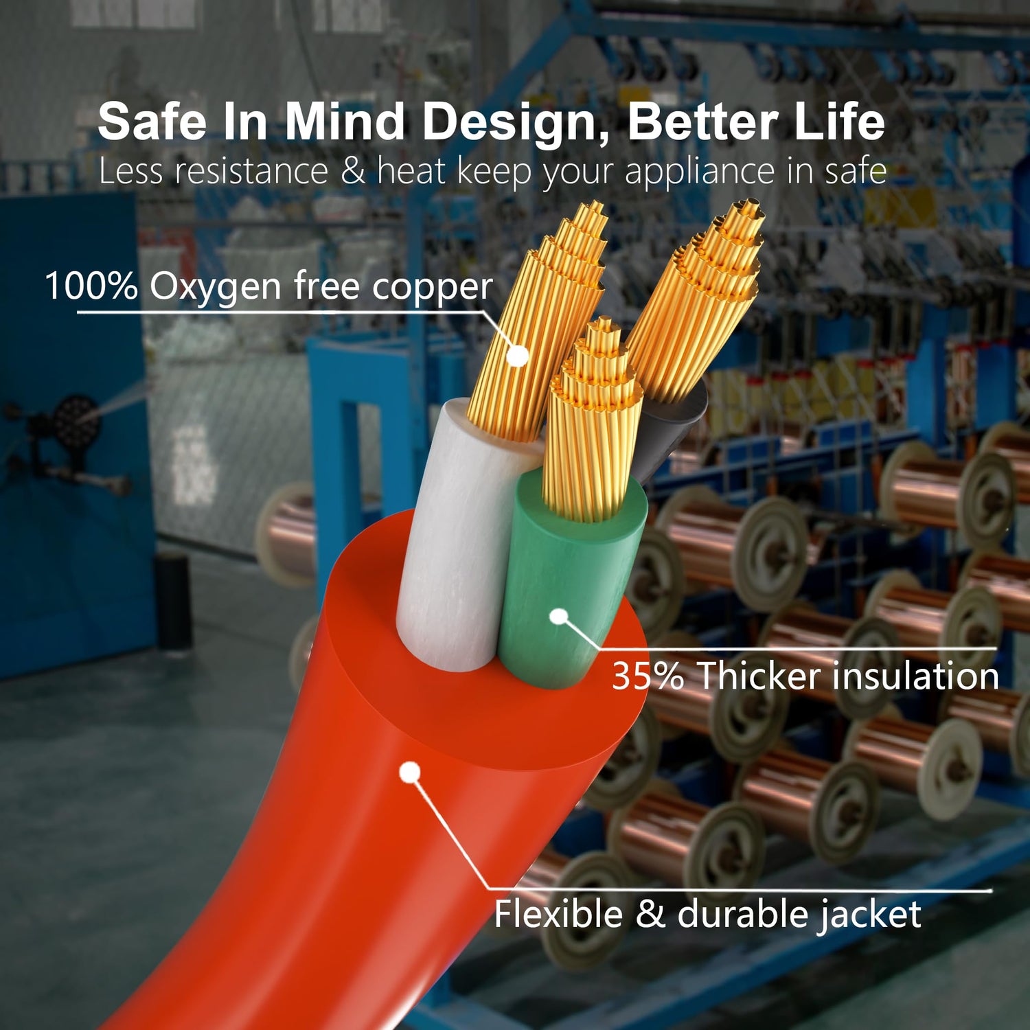 - Many Application Power Cord Extension: 3 prong grounded outlet 12 AWG extension cord 100 foot; The PVC outer jacket is flame-resistant, waterproof, weather-resistant, cold-resistant -50°C, corrosion-resistant suitable for indoor and outdoor, home office use, and industrial extension cord; The shiny orange color for easy visibility provides extra safety and avoids tripping while working