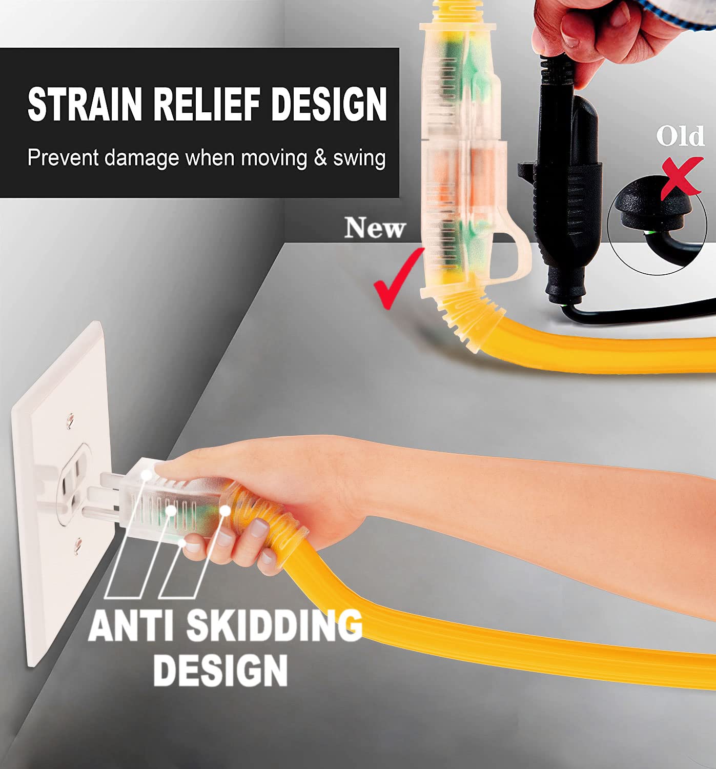 - Lighted End and Extra Size for Safety: The power socket indicator light shows that power is on and the heavy duty extension cord 75 ft is ready for work; extra size male nema 5-15p power plug and female nema 5-15r power socket for safety; It is thicker and more durable than the normal type on market and has high insulation safety performance to prevent electric shock; ETL/cETL listed for safe approval