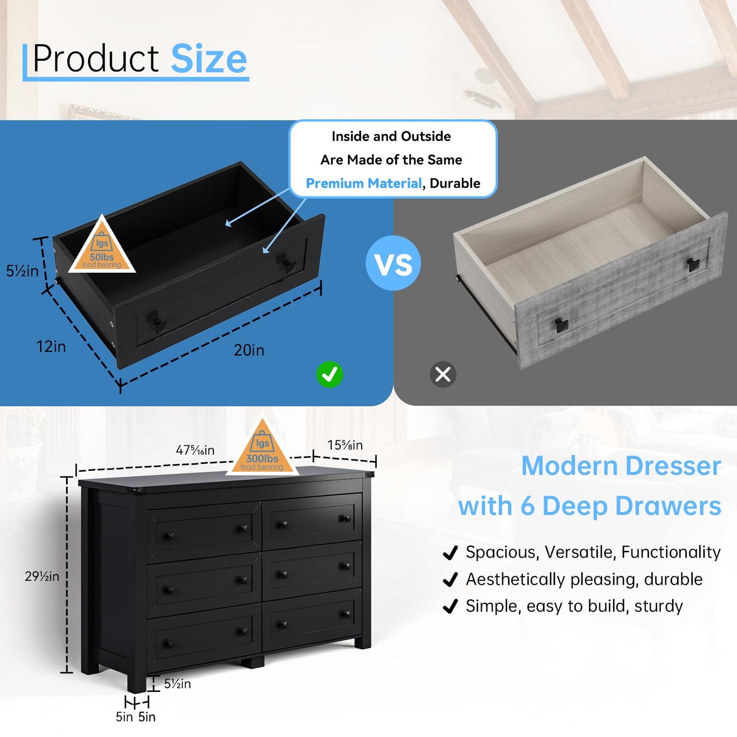 - [๐๐ฆ๐ฉ๐ฅ๐ ๐๐ญ๐จ๐ซ๐๐ ๐ ๐๐ฉ๐๐๐]: This bedroom dresser assembled dimension measures 47.3" L x 15.6" W x 29.5.0" H. Each wood chest of drawer measures:20" L x12" W x5.5" H. the solid top of this black dresser can be used as a TV cabinet and perfect for displaying photos, bouquets, potted plant, lamps, candlesticks, vases, and abstract decorations. 6 large drawers to store and sort clothes, books,towels, linens, toys and other essentials to help keep the room neat, tidy and organized.