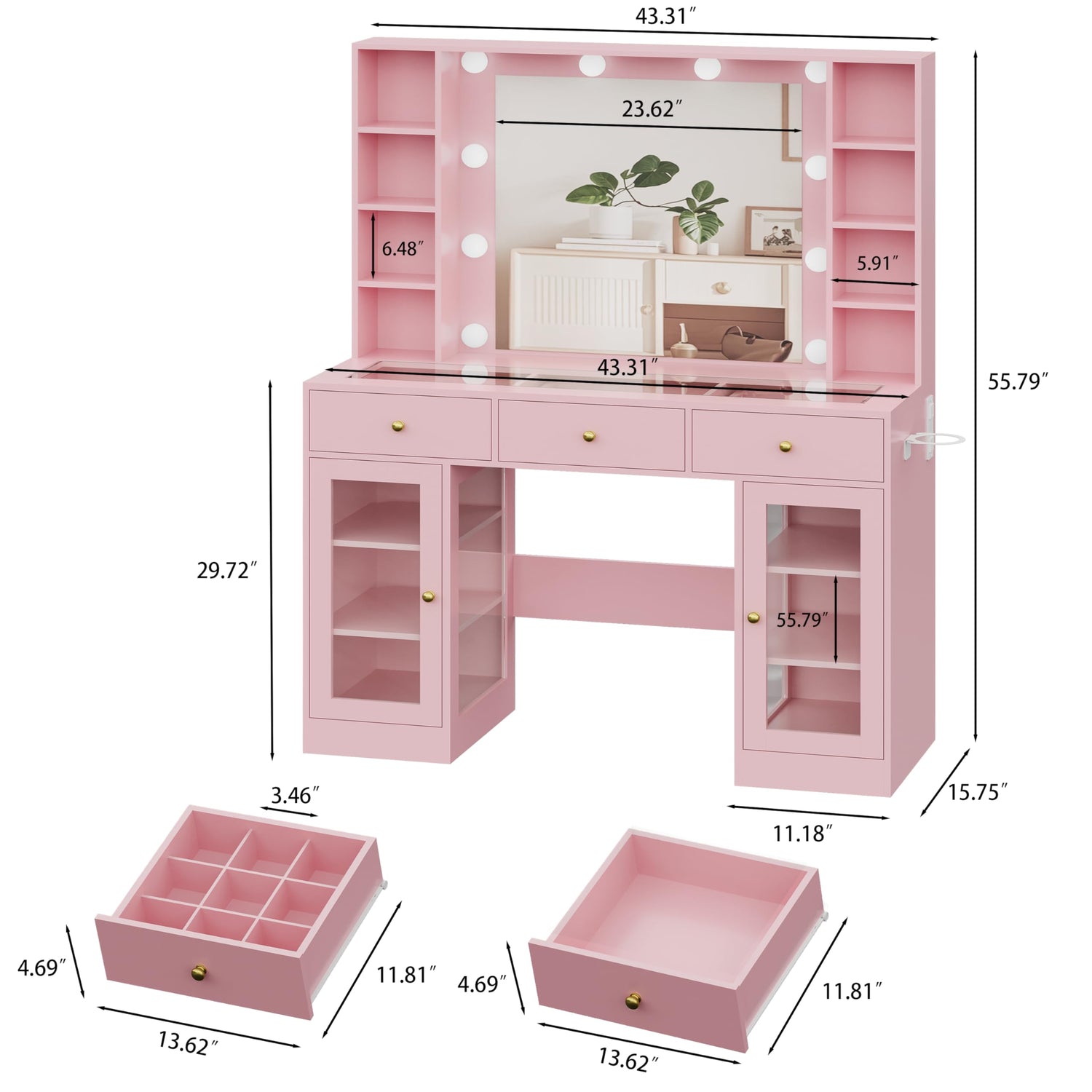 - 【GLASS TOP VANITY DESK】Overall size is 43.3"(L)x15.7"(W)x55.7"(H), Pink vanity desk with mirror and lights offers ample storage with 2 glass cabinet, 3 spacious drawers and 6 storage shelves, perfect for keeping yours neatly organized. Makeup vanity features the HD glass vanity tabletop, which give you a clear view to keep neatly organized drawers. Perfectly meets your needs of aesthetics and practicality,
