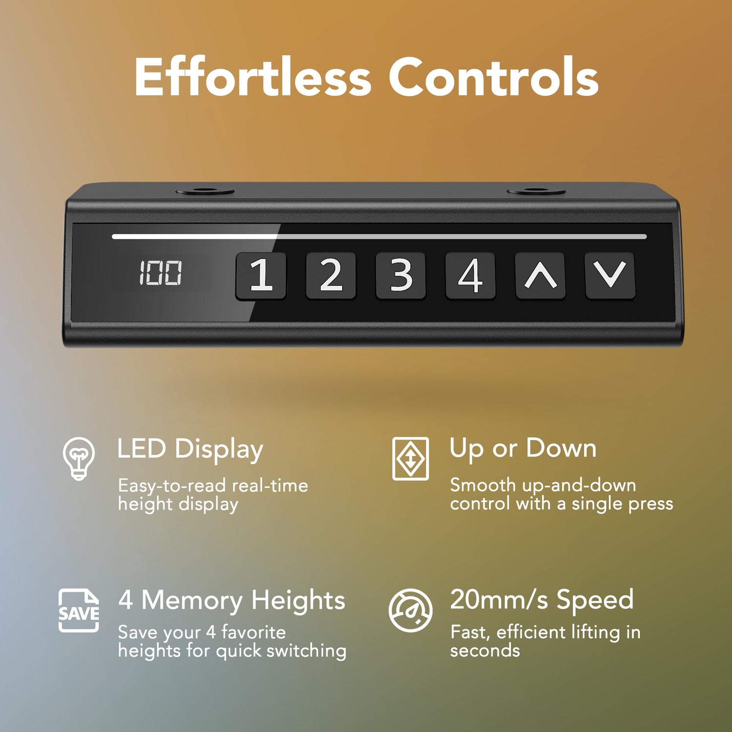 - Convenient Memory Presets: Featuring four programmable height settings, the smart control panel lets you switch to your preferred height with a single touch—no more tedious manual adjustments.