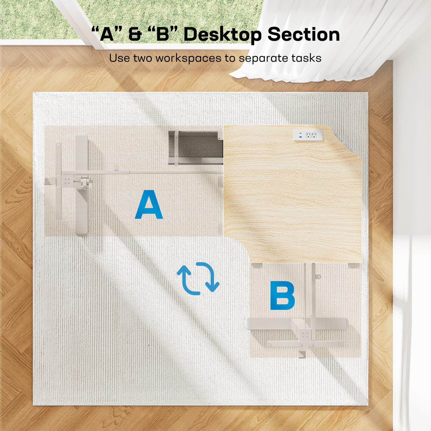 - Integrated Power Strip: The main desktop features a flush-mounted power strip with two power outlets and two USB charging ports (Type-A and Type-C). With ETL and FCC certifications, you can enjoy a reliable power supply right on the desktop to charge phones, headsets, and other devices.
