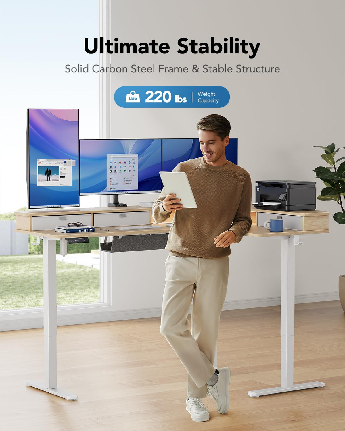 HUANUO 65″ L-Shaped Standing Desk with Power Outlets & LED Strip, Electric Height Adjustable Corner Computer Desk, Sit Stand Up Desk with 3 Drawers, Natural Wood