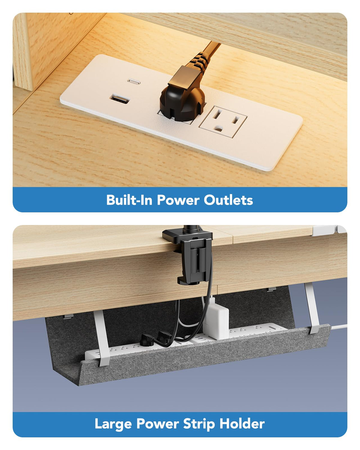 - Integrated Power Strip: The main desktop features a flush-mounted power strip with two power outlets and two USB charging ports (Type-A and Type-C). With ETL and FCC certifications, you can enjoy a reliable power supply right on the desktop to charge phones, headsets, and other devices.