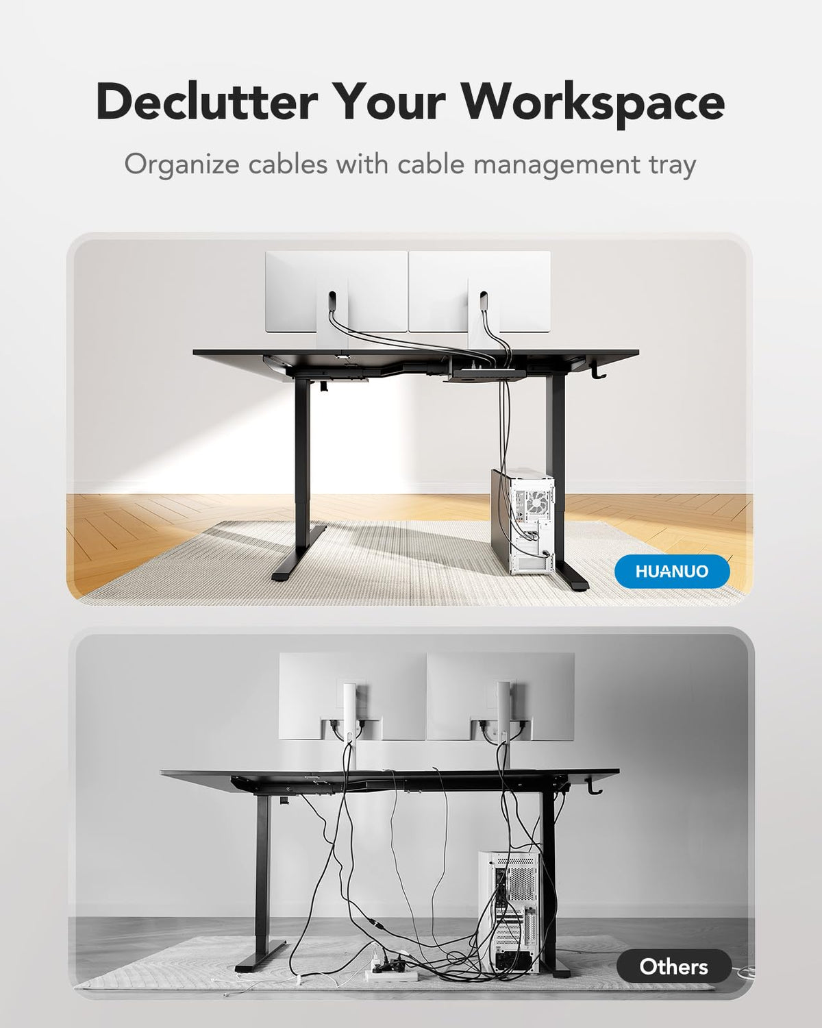 - Strong Support for Dependable Durability: This dual-motor standing desk can support up to 220 lbs thanks to a 50% wider solid carbon steel frame and 20% thicker desktop. Huanuo adjustable desks are tested to withstand 50,000 lift cycles for long-lasting performance, powered by dual motors for smooth and steady lifting.