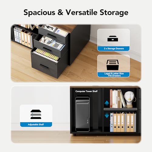 - Efficient Storage Solution: The executive standing desk comes with two top drawers ideal for organizing small items such as pens, notepads, and accessories. The large bottom drawer fits hanging Letter-sized files vertically and Legal-sized files horizontally. On the left, open shelves offer space for your computer tower. Enjoy a tidy and efficient workspace with everything within easy reach.