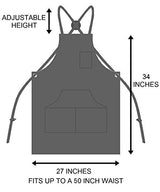 - All-Day Comfort + Customized Fit - Prevent neck pain with padded (removable) cross back straps. Full coverage bib apron is 27 inches wide x 34 inches tall for unisex sizing (recommended for 5' 2" or taller). Grommets + long straps + buckle allow for a range of adjustments up to a 50 inch waist!