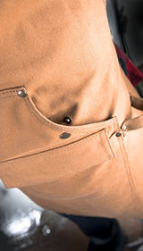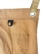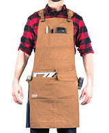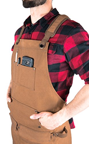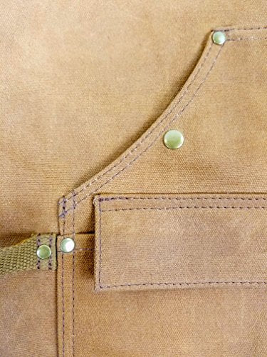 Details: Why buy a consumable product when you can invest in an enduring piece you are proud of? Made with heavy-weight 16oz waxed canvas, this work apron is both water repellent and durable enough to stand up to tough tasks. Subtle details make this a stylish piece for both men and women: double reinforced stitching on all pockets and straps; rivet reinforcement on key pockets; metal grommets for custom fit; and heavy brass hardware on flat brown canvas for a low-key, professional look. The cross-back (x-back) strap design allows for a custom fit and comfortable weight distribution. Long straps have been utilized to accommodate larger sizes. This adjustable bib apron is 27 inches wide x 34 inches tall, making it perfect for men and women of most sizes, including "big and tall". Accommodates waist sizes up to 50 inches. 2 side-by-side tool pockets in the front measure approximately 8 inches wide by 6.5 inches tall each. Behind is a full "kangaroo" style pocket. A chest pocket (approx 4 inches wide x 4.5 inches tall) is designed to fit cell phones, pencils, and small tools. Suggested Care: Gentle scrubbing with a damp rag is recommended for minor cleaning. Machine washing and detergent will deteriorate the wax quality and is strongly advised against. A mild castile soap and water mixture may be utilized to scrub and brush tougher spots. Rewax as necessary with a bar of fabric wax and thorough heating.