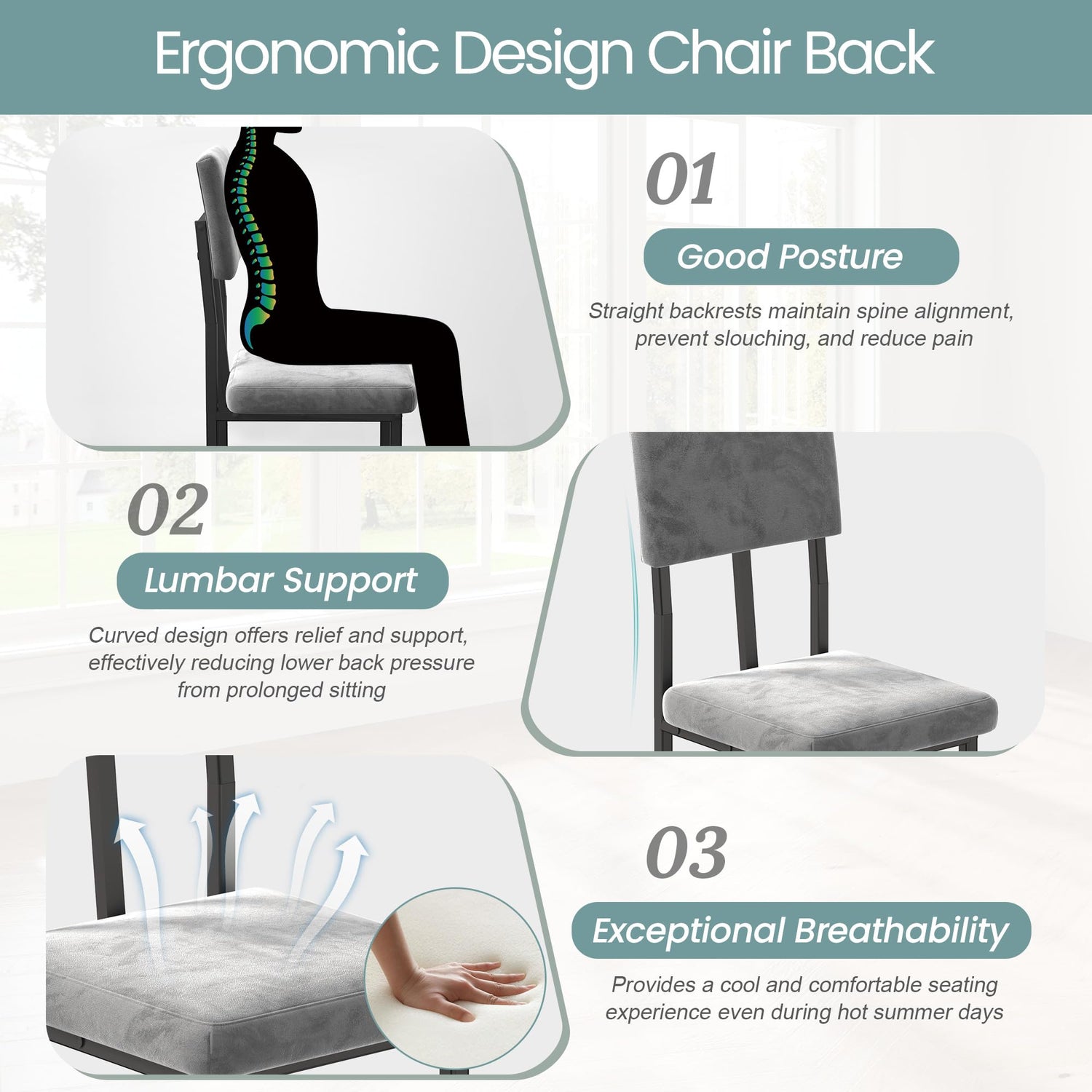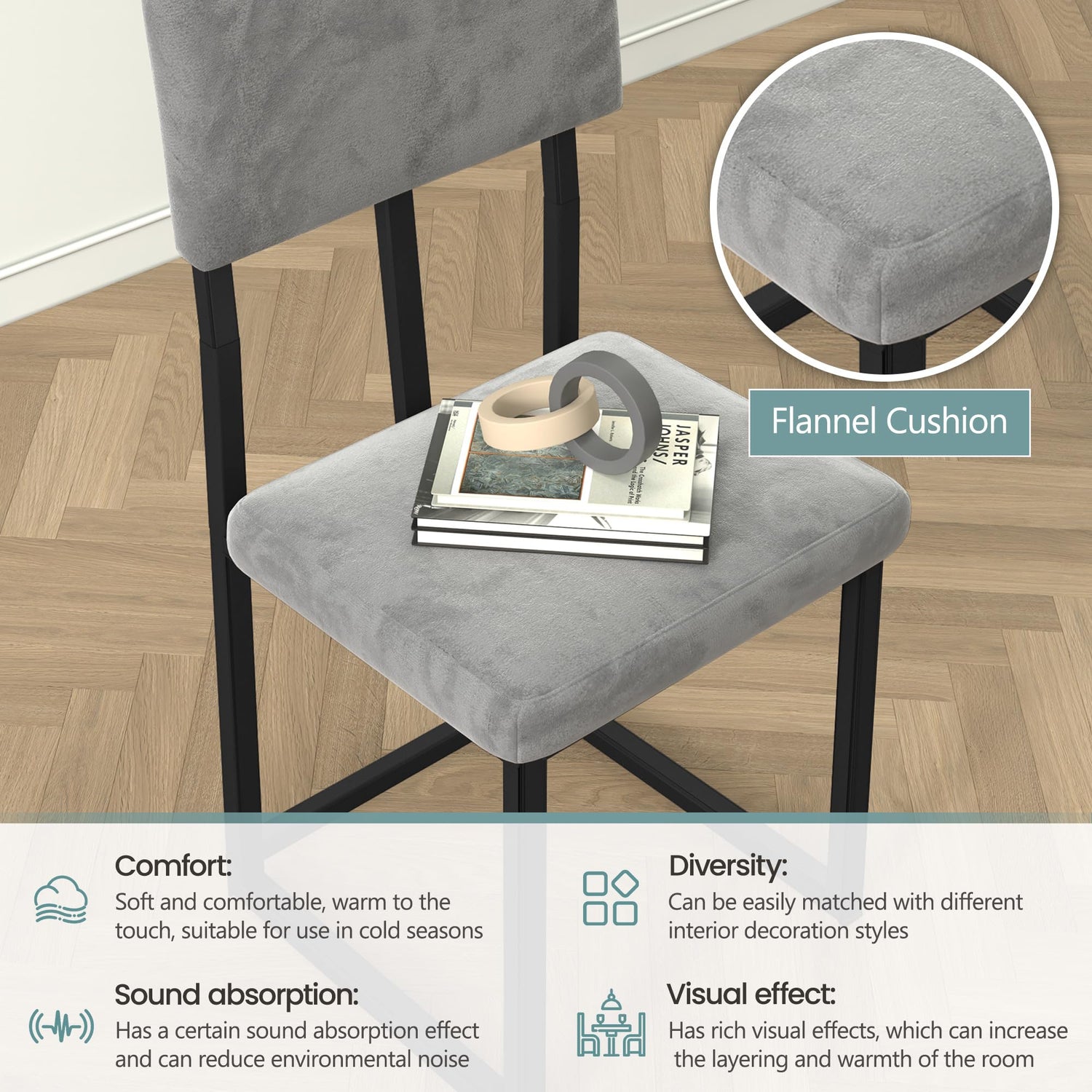 - COMFORTABLE VELVET CUSHIONS: Designed for long sitting without discomfort, the chairs are filled with high-density foam that is soft, comfortable, and offers excellent resilience. Paired with breathable gray velvet fabric, they provide a skin-friendly touch and comfort, making them ideal for extended seating. This ensures a pleasant dining experience for you and your family