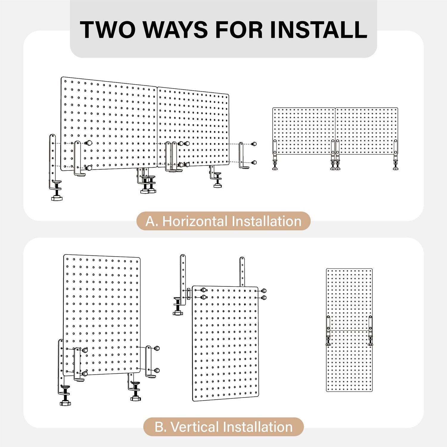 - Dual-Orientation Design: With 2 pegboards and 4 brackets, our clamp on desk pegboard allows for both horizontal and vertical mounting—mount horizontally for under-desk cable management or vertically for an above-desk workspace organizer.