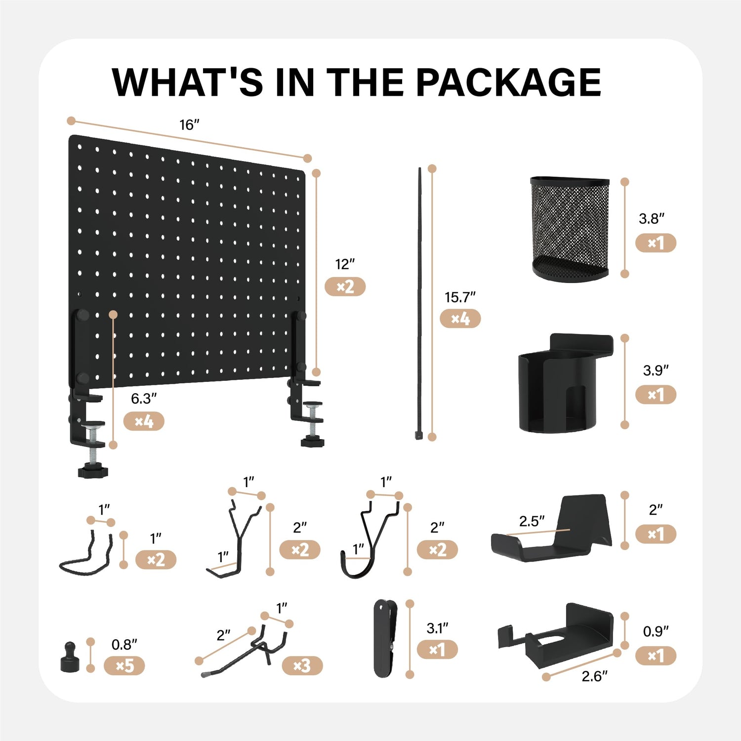 - Comprehensive Accessory Kit: This clamp on pegboard includes 2 x 12*10" pegboards, 4 x brackets, 1 x cup holder, 1 x gamepad holder, 1 x pen container, 1 x note clips, 2 x plier holders, 2 x 1-inch L hooks, 2 x 1-inch J hooks, 3 x 2-inch hooks, 5 x magnets, and 4 x cable ties. Customize your storage with these thoughtfully designed accessories.