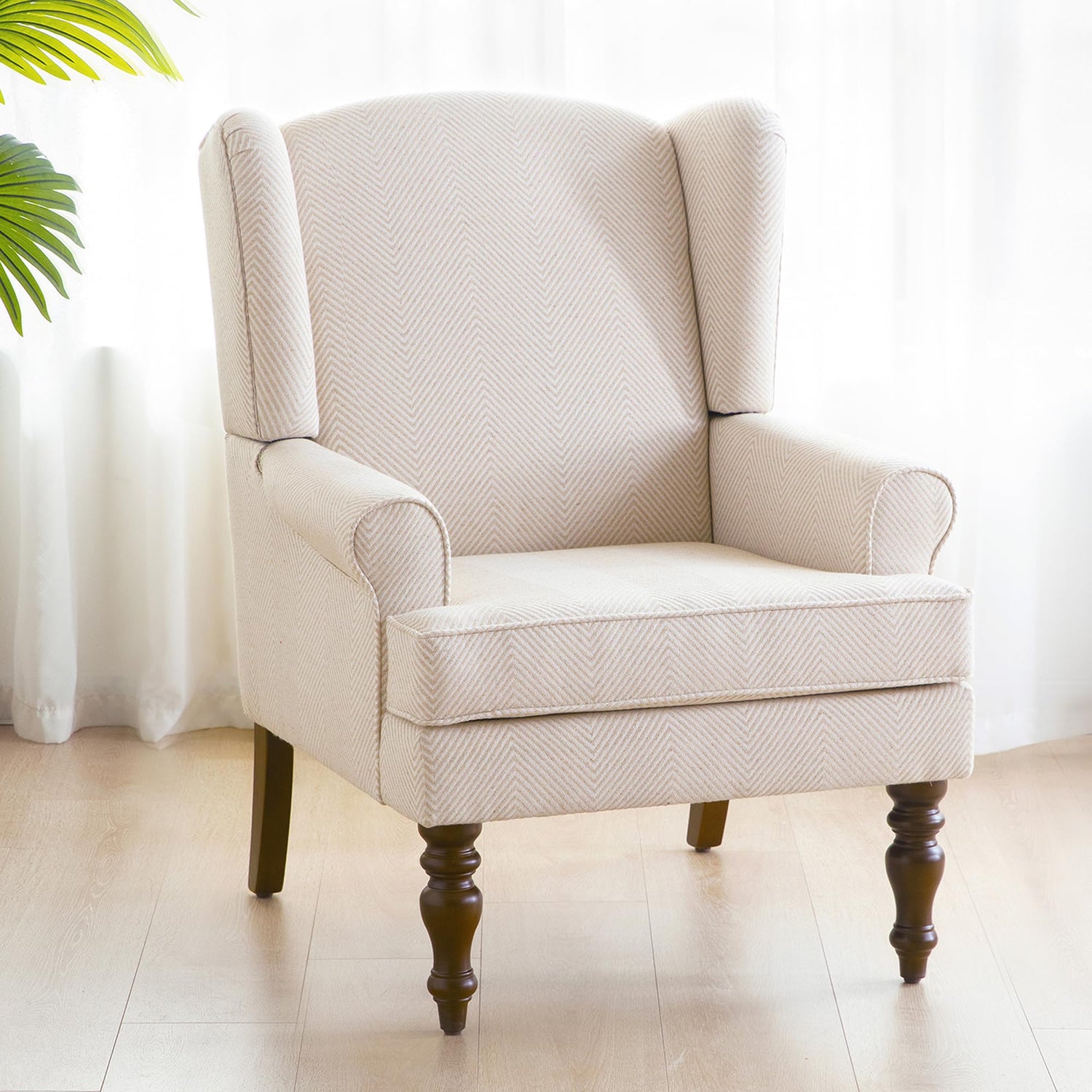 HUIMO Living Room Chair Upholstered High Back Armchair Retro Printed Wingback Chair in Linen for Bedroom & Study Comfy Accent Sofa Chair Reading Chair Holds 300lbs (Navy Blue) (1, Tan with Lines)