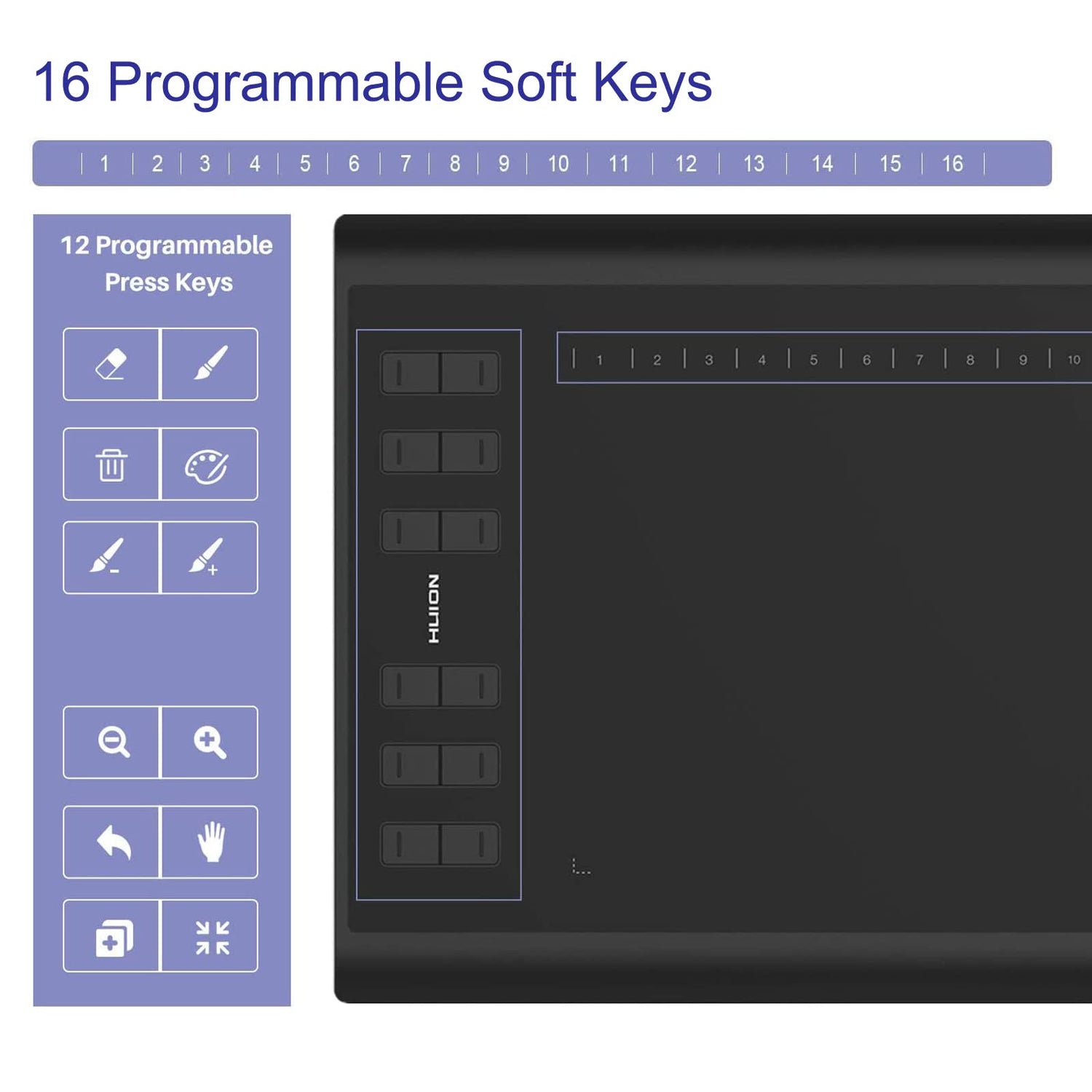 • Press Keys:12 programmable press keys plus 16 programmable soft keys, you can set shortcut keys on drawing tablet's driver based on your preferences, such as erase, zoom in/out, scroll up and down, and so on.