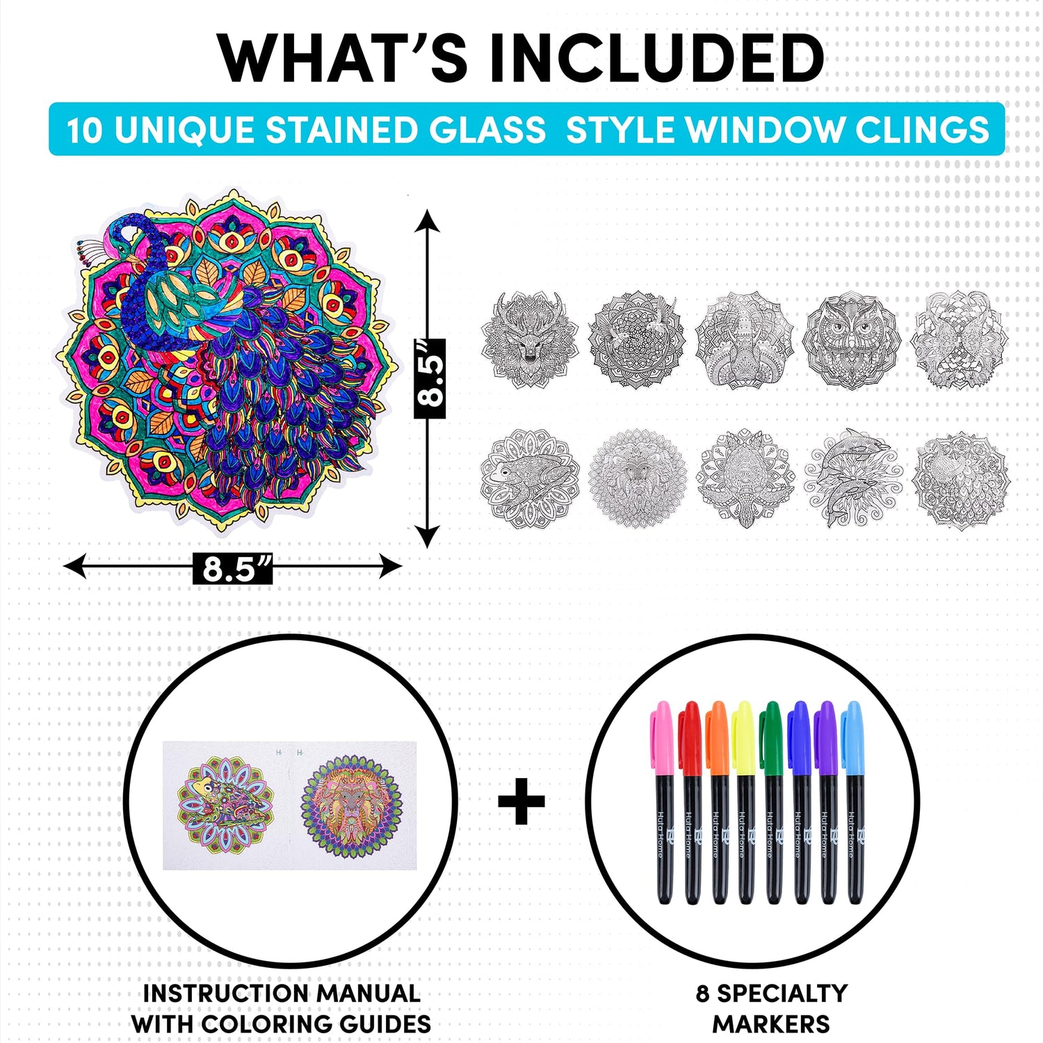 - 【10 Unique Clings & 8 Colors】These specialty arts and crafts kits for adults and teens include 10 Blank Window Clings Vinyls for you to color (with 10 Unique Designs), 8 Specialty Dual Tip Markers (with 8 Different Colors) and a Manual with Coloring Guides for inspiration. We have included everything you need in these DIY kits to enjoy a calming, stress-relieving coloring experience and create a stunning stained glass style end product to boot!