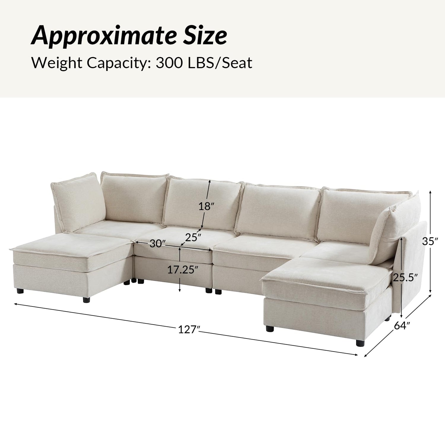 - 【Spacious and Cozy】Sofa size: 64" D x 127" W x 35" H. Single seat size: 25" D x 30" W x 17.25" H. Weight Capacity: 300 lbs / Seat. Oversized and wider seats designed for larger people and extra room. Whether you're watching TV, reading or chatting with family and friends, this spacious oversized modular sectional couch offers plenty of room for comfort and relaxation.