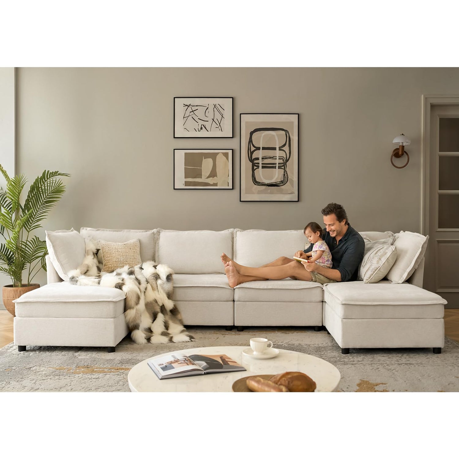 HULALA HOME 127'' Modular Sectional Sofa, Oversized U Shaped Couch with Storage Ottoman, Extra Deep Seat, Modern Comfy Chenille Sofa with Chaise, 6 Seat Convertible Couches for Living Room, Biege