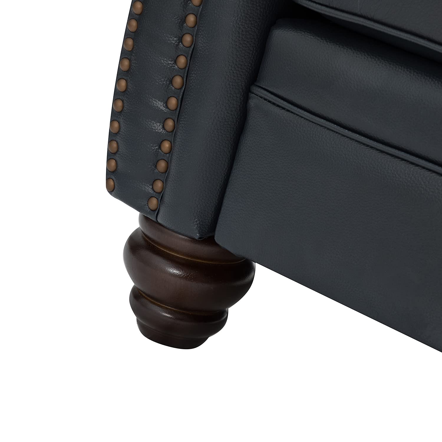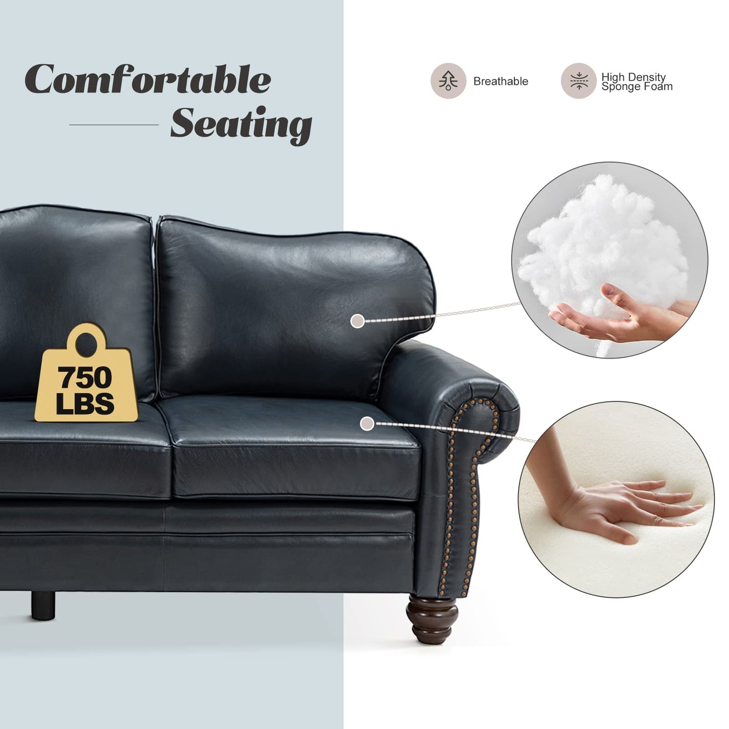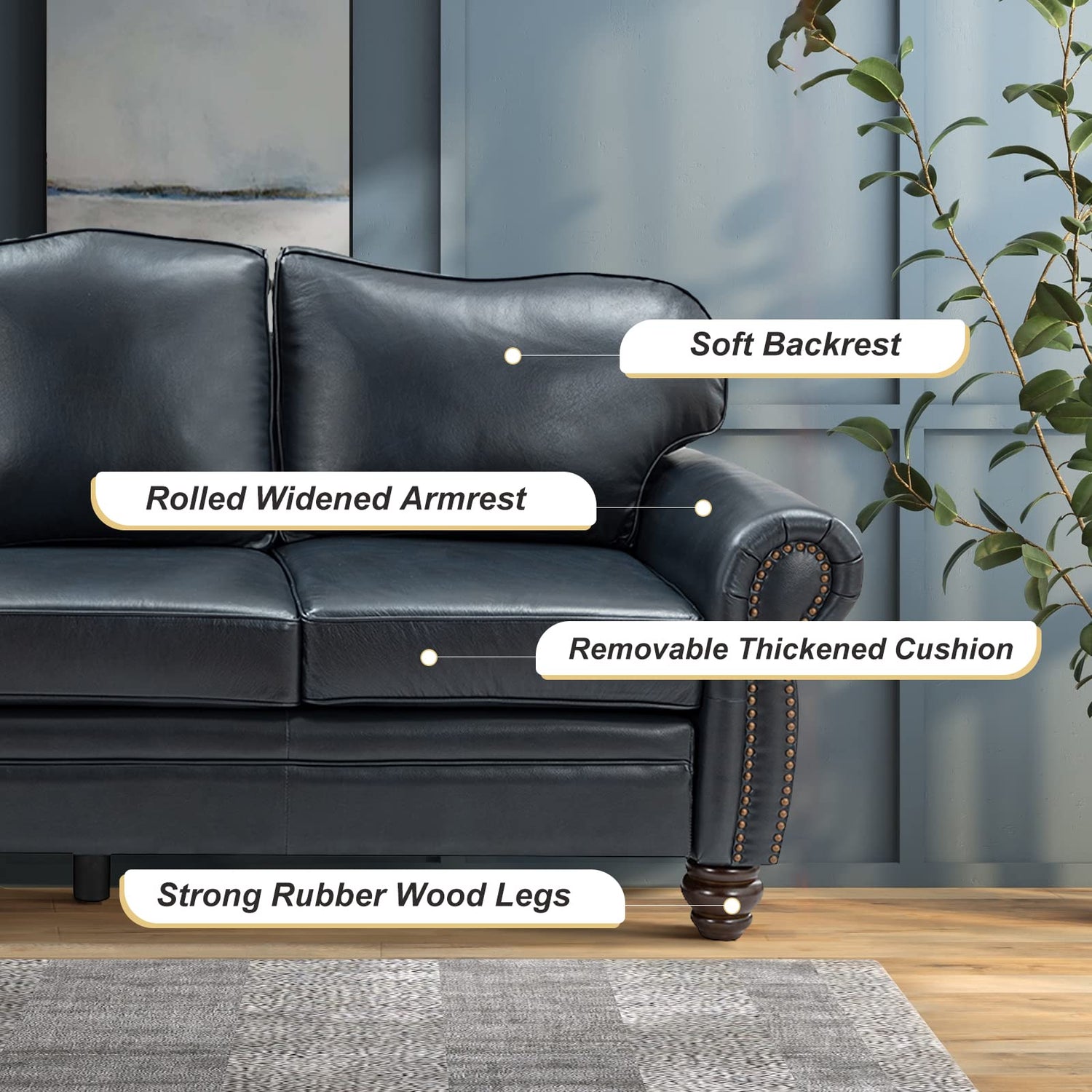 HULALA HOME 81'' Upholstered Leather Sofa with Removable Cushion, Mid-Century Modern Living Room 3-Seater Couch, Full Grain Leather Couch with Nailhead Trim and Rolled Arm for Bedroom Apartment, Navy